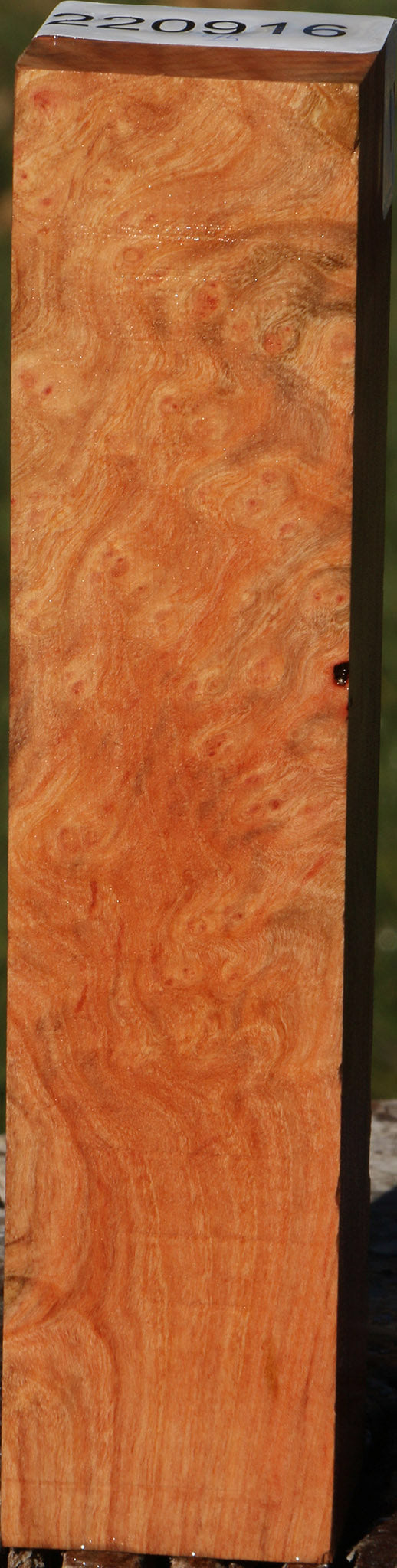This Madrone burl lumber has pinkish brown color and lots of interesting grain! Dark red streaks might be present in some pieces. Madrone is a Pacific Northwest hardwood that is very easy to work with and finish. This burl was pressure cooked and vacuum kiln dried. The internal stress has been removed through the pressure cooking process. An occasional surface or edge check may be present. Checks or inclusions are normal in the burl eyes. If black color is present on the edges of the board, it usually does not penetrate further than 1/4". This is a gorgeous species that is ideal for many woodworking projects! This piece has inclusions. Please see pictures for details.