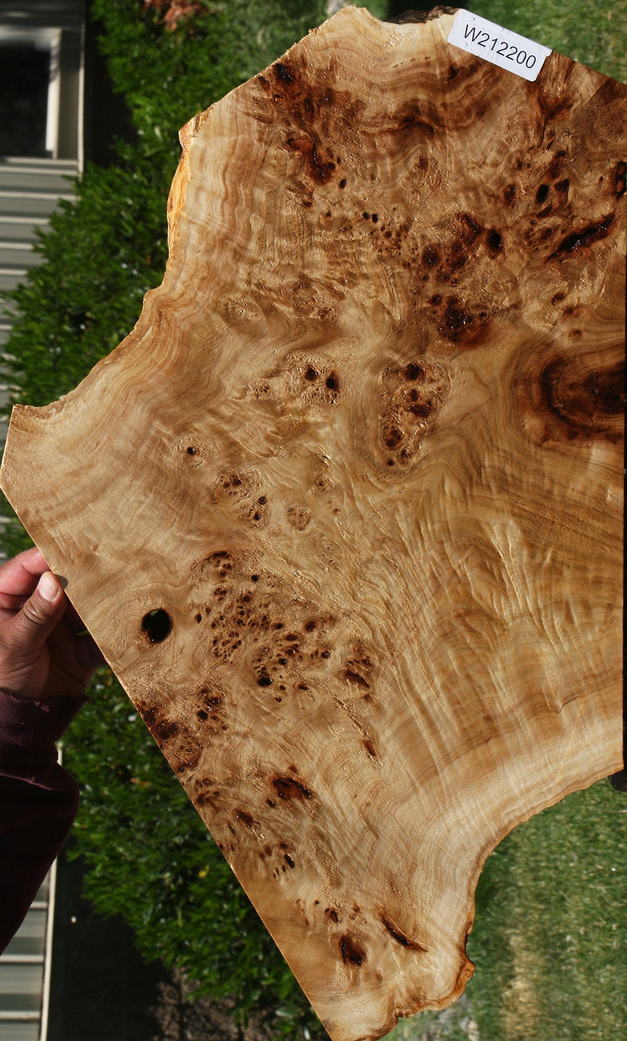 This stunning Mappa Burl has golden/cream colors with figure and burl. Kiln dried and surfaced on two sides, this unique species is ready for your creations. A slight 1/16" to 1/8" bow or twist may be present in boards over 3 ft. long. Small inclusions may be present in burl eyes. This log produced some beautiful live burly edges.