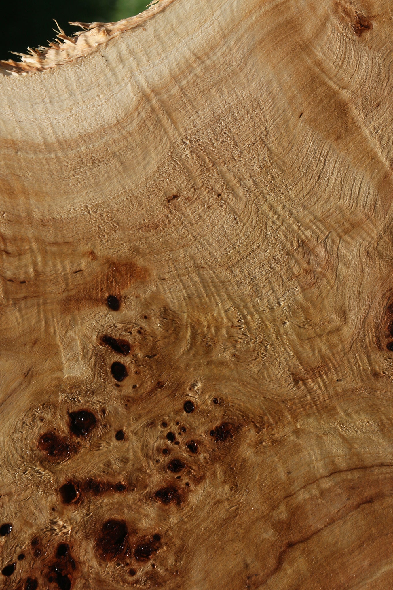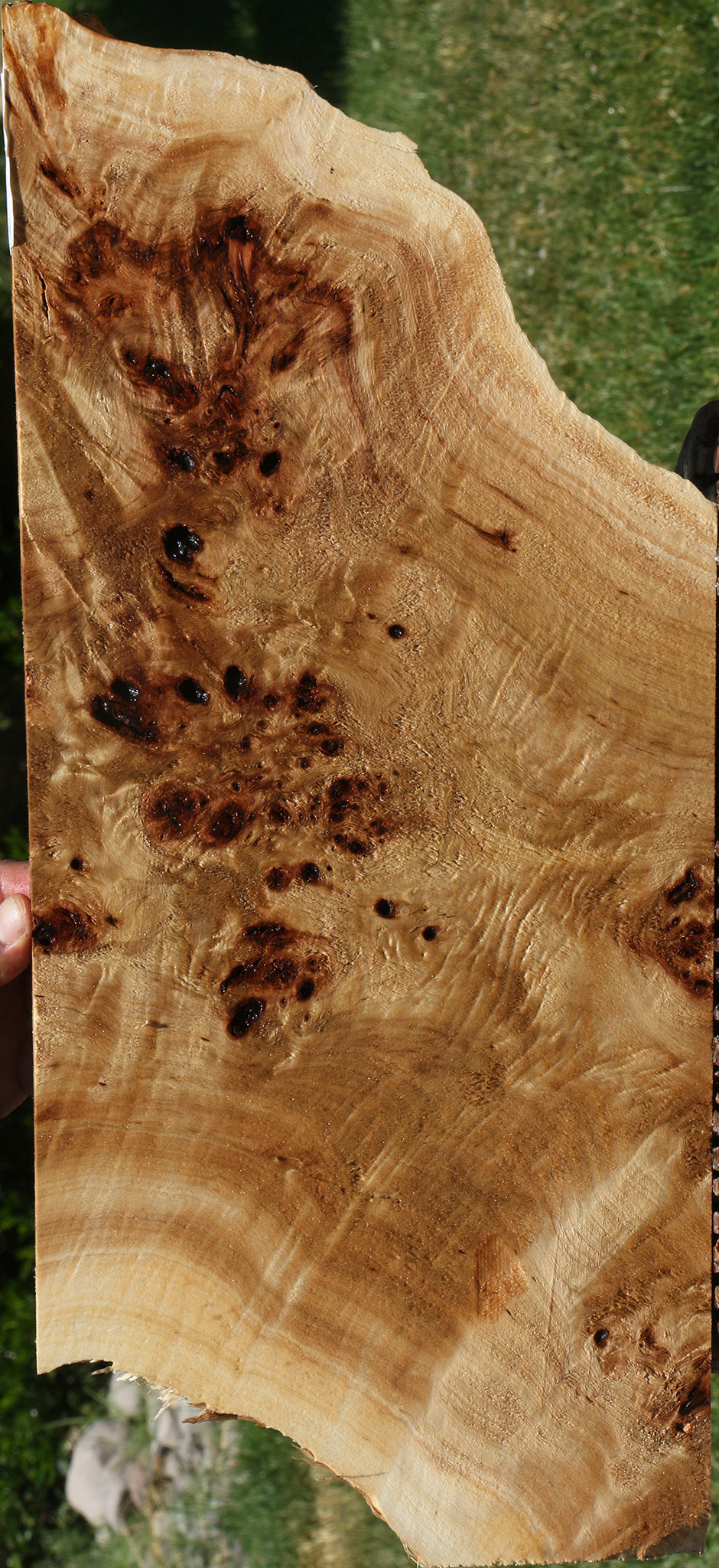 This stunning Mappa Burl has golden/cream colors with figure and burl. Kiln dried and surfaced on two sides, this unique species is ready for your creations. A slight 1/16" to 1/8" bow or twist may be present in boards over 3 ft. long. Small inclusions may be present in burl eyes. This log produced some beautiful live burly edges. This piece has a partial live edge and a void. Please see pictures for details.