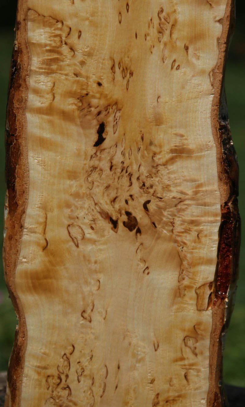 Masur Birch is an excellent choice for many different projects! Most of the wood has nice figuring that is very similar to burl or birdseye Maple though of a different origin. The creamy, golden color with dark brown streaking yields stunning contrast for specialty and decorative items. Pieces with wild figure may have some bark incursions. A minor check or pin knot may be present. Workability of this very rare wood is excellent. Our material is kiln dried and ready to use. Live bark edges are present on some pieces.