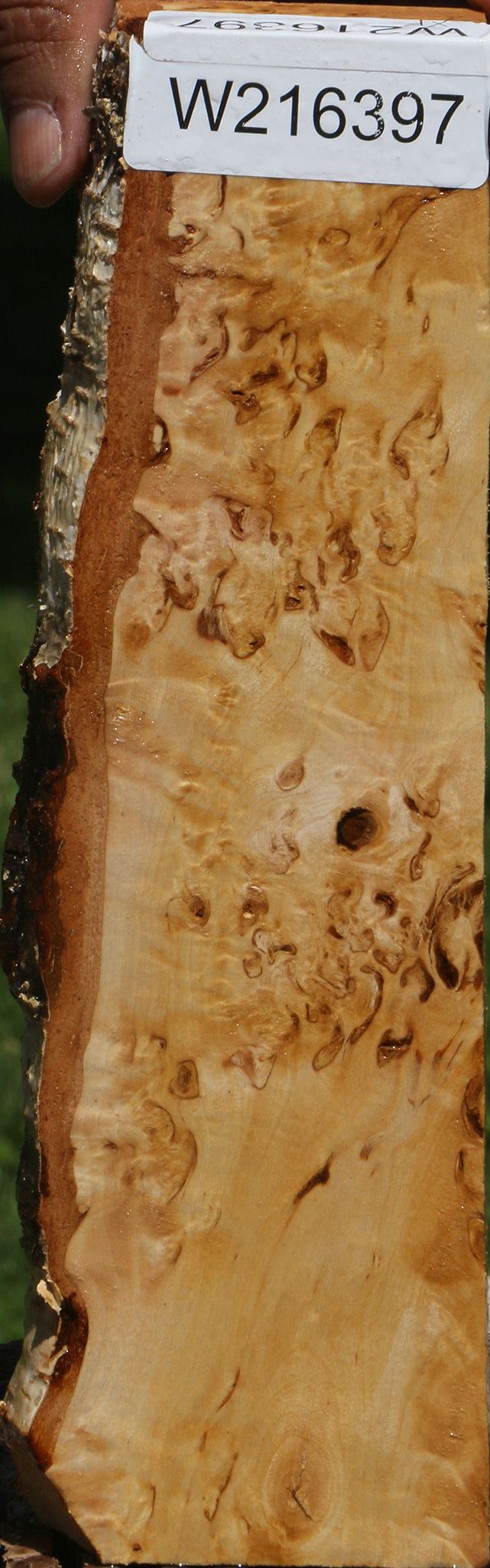 Masur Birch is an excellent choice for many different projects! Most of the wood has nice figuring that is very similar to burl or birdseye Maple though of a different origin. The creamy, golden color with dark brown streaking yields stunning contrast for specialty and decorative items. Pieces with wild figure may have some bark inclusions. A minor check or pin knot may be present. Workability of this very rare wood is excellent. Our material is kiln dried and ready to use. Live bark edges are present on some pieces. This piece has checks and inclusions. Please see pictures for details.