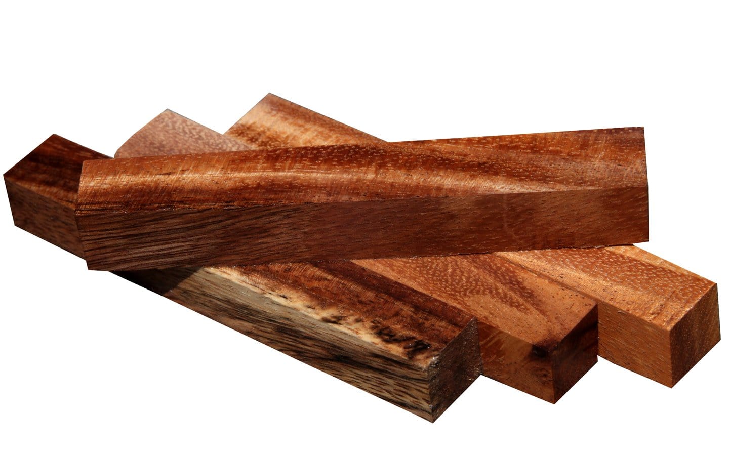 The measurements above are for the shipping size. Each individual blank measures 5" x 3/4" x 3/4" (several blanks are shown to indicate the range of color/grain to expect). Monkeypod...