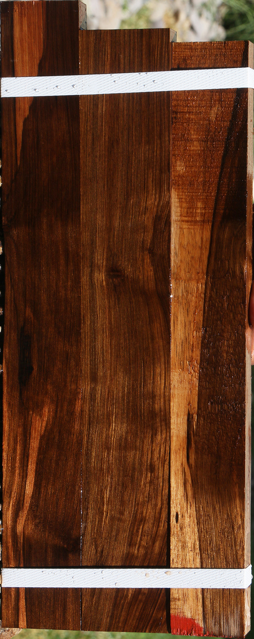 Monterillo Rosewood exhibits dark stripes through a honey brown background. It resembles striped Ebony as opposed to the Southern variety of Monterillo Rosewood that resembles Brazilian Rosewood. This hardwood produces a beautiful finish. Boards over 36" may have a slight 1/16" to 1/8" crown. This high quality, kiln dried lumber has been surfaced on two sides and is ready for your wonderful creations. This is our last batch of this specialty hardwood! This is a 3-piece set. The measurements above are for the shipping size. Please note the individual measurements. Piece 1 measures 15-1/8" x 1-15/16" x 3/4". Pieces 2 measures 14-1/2" x 2-3/16" x 13/16". Piece 3 measures 14-3/16" x 1-13/16" x 3/4". One or more of these pieces has planer skip. Please see pictures for details.