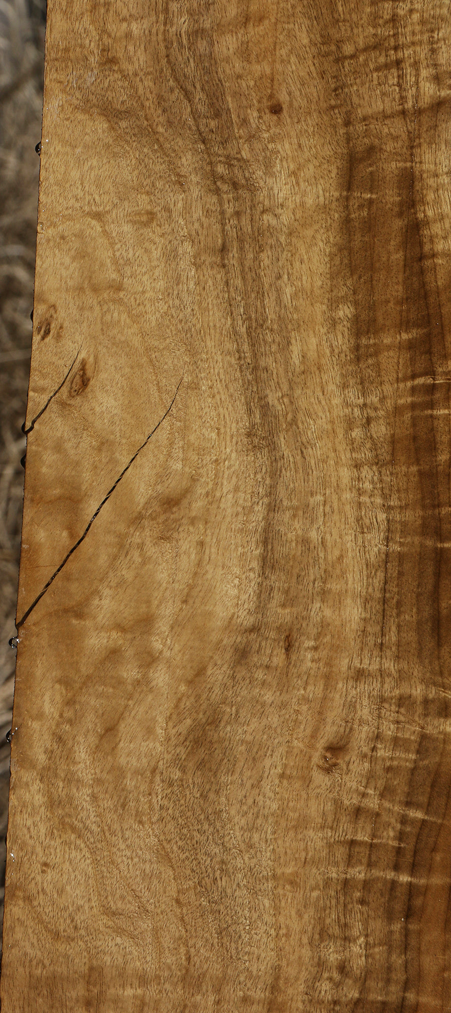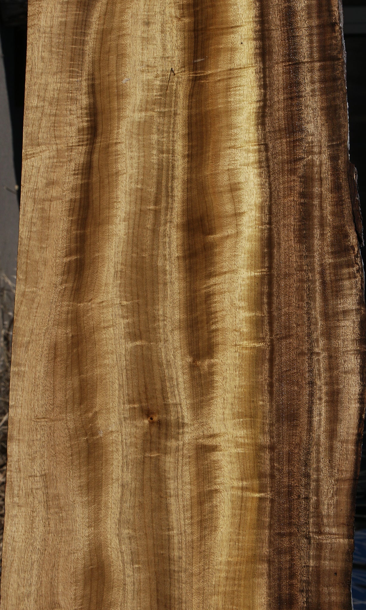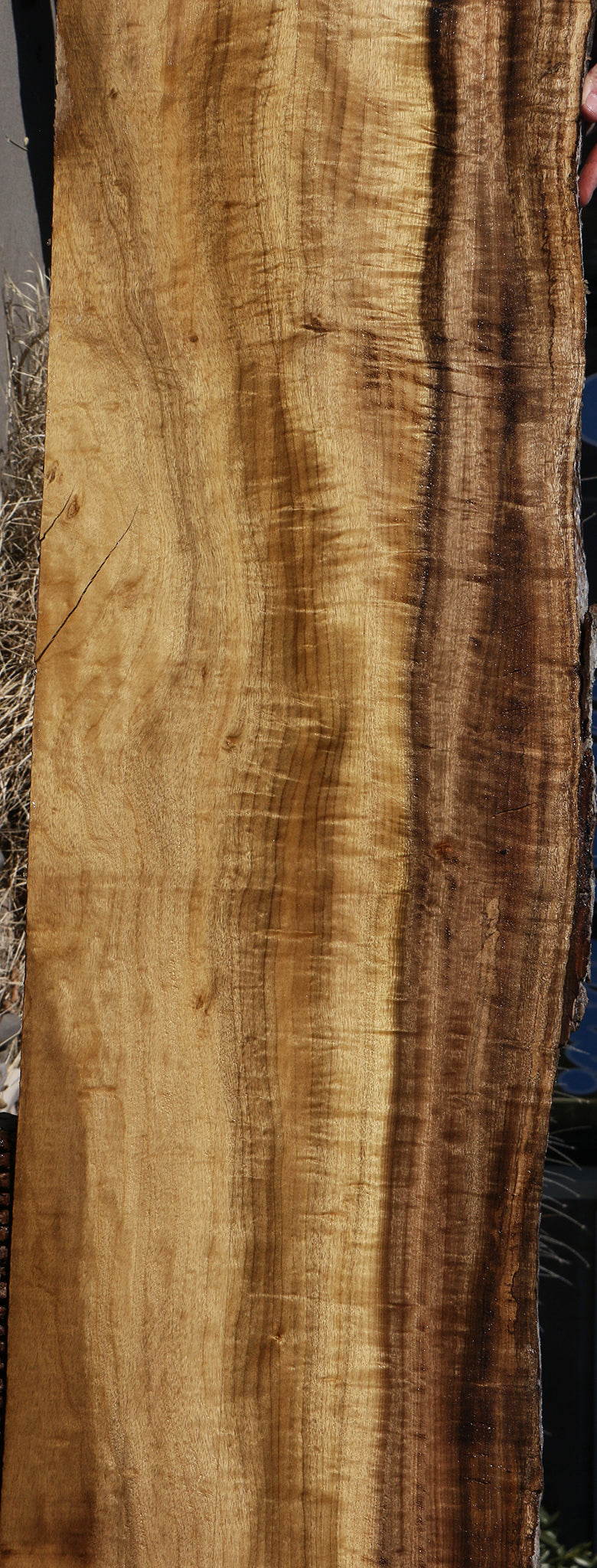 This figured Oregon Myrtlewood lumber was cut for high end woodworking projects from a figured & colorful log! Patterns range from fiddleback to amazing color contrast with all combinations in between! Oregon Myrtlewood is an exceptional choice due to its easy workability. This stock is kiln dried, surfaced on two sides, and ready to use. Boards over 36" may have a 1/16" to 1/8" bow/twist. A minor end/surface check or small pin hole may be present. Shop this rare Northwest hardwood and make something truly unique. This piece has checks and splits. Please see pictures for details.