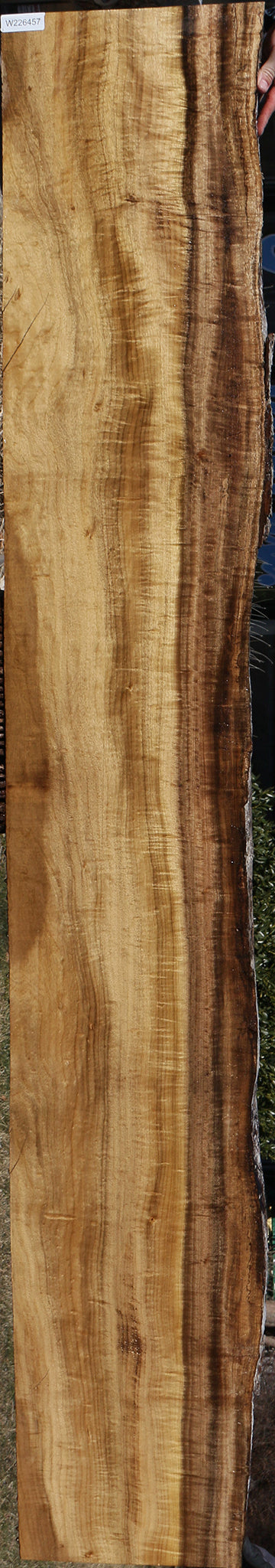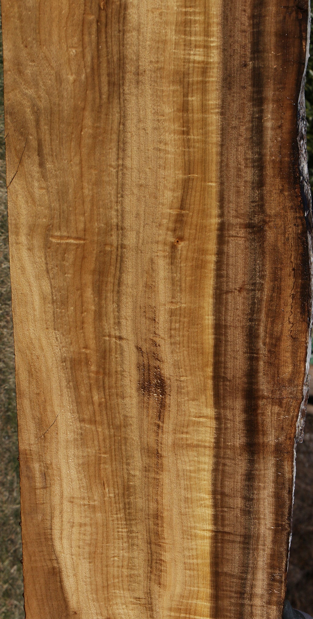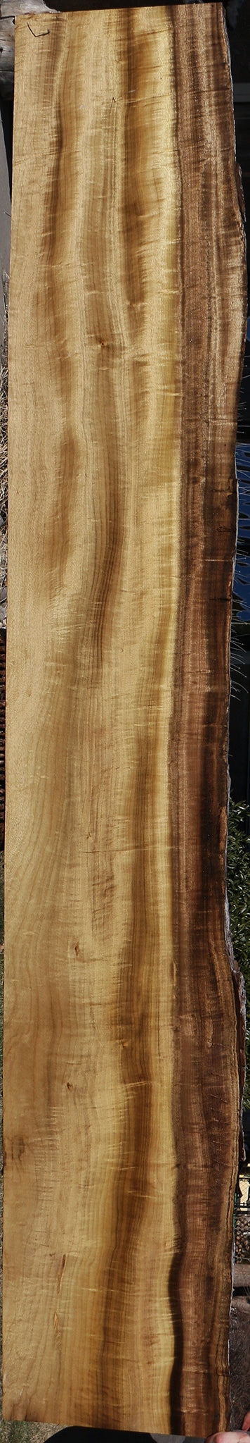 This figured Oregon Myrtlewood lumber was cut for high end woodworking projects from a figured & colorful log! Patterns range from fiddleback to amazing color contrast with all combinations in between! Oregon Myrtlewood is an exceptional choice due to its easy workability. This stock is kiln dried, surfaced on two sides, and ready to use. Boards over 36" may have a 1/16" to 1/8" bow/twist. A minor end/surface check or small pin hole may be present. Shop this rare Northwest hardwood and make something truly unique. This piece has checks and splits. Please see pictures for details.