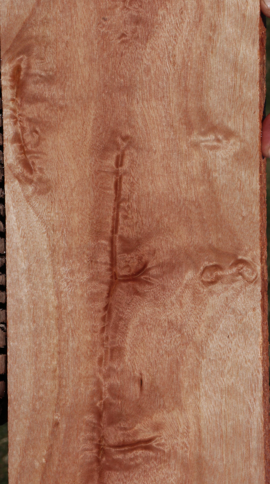 Okoume is similar to Mahogany in its working & finishing properties. It sands & finishes well, yielding bright and cheery projects due to its iridescence. Pinkish/brown to golden tones with lovely figure make it an excellent choice for a wide variety of woodworking projects. 1/16" to 1/8" bow may be present in boards over 36". The wood is kiln dried, surfaced on two sides, and ready for use. This piece has inclusions. Please see pictures for details.