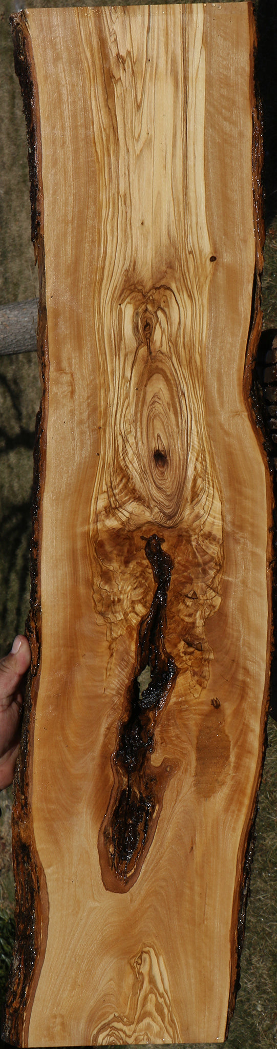 This beautiful batch of Italian Olive lumber has a range of figure, color, and lovely grain. Kiln dried and surfaced on both sides, the wood is ready for use now. Occasional checks and knots may be present. The wood is 95% free of defects or better. 1/16" to 1/8" bow/twist may be present in boards over 36". Ends have been wax sealed. Italian Olive is a great wood for charcuterie boards, cheese trays, and cutting boards! This piece has inclusions and a void. Please see pictures for details.