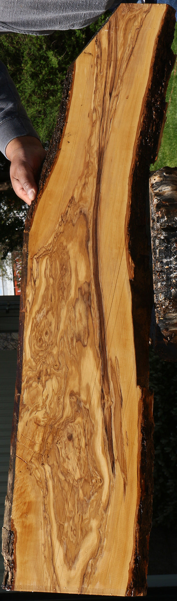 This stunning batch of Italian Olive lumber showcases a rich variety of figure, vibrant color, and elegant grain patterns. Kiln-dried and surfaced on both sides, these boards are ready to use right away. Some pieces may feature natural live edges, small checks, or knots, adding to their unique character. Boards over 36" may have a slight bow or twist (1/16" to 1/8"). The ends are wax-sealed for added stability. Italian Olive is an excellent choice for charcuterie boards, cheese trays, cutting boards, and other handcrafted projects! This piece has splits. Please see pictures for details.