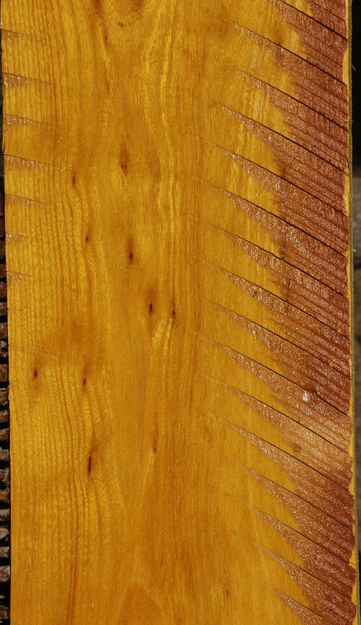 This Osage Orange material has incredible golden to bright yellow color! As it ages and picks up UV light, it turns into a medium brown/orange color. An occasional minor check...