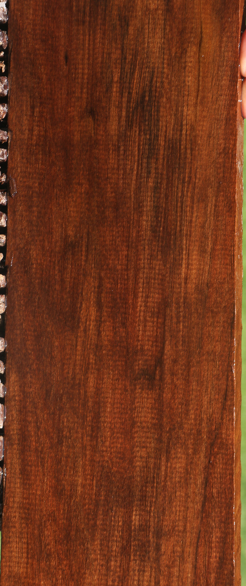 This high quality, chocolately-brown colored Peruvian Walnut is kiln dried and is smooth on two faces, having been surfaced on two sides with a spiral cutter head planer. Minor planer bite may be present on a few boards. The ends are clean and smooth. Boards over 36" long may have a slight 1/16" to 1/8" bow or twist. Some boards have fiddleback; the degree of figure ranges from board to board. All boards are very beautiful and take a nice natural luster. This hardwood species is ideal for your woodworking projects. This piece has inclusions. Please see pictures for details.