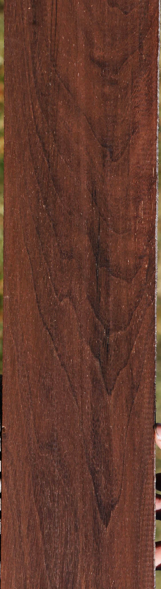 This high quality, chocolately-brown colored Peruvian Walnut is kiln dried and is smooth on two faces, having been surfaced on two sides with a spiral cutter head planer. Boards over 36" long may have a slight 1/16" to 1/8" bow or twist. Some boards have fiddleback; the degree of figure ranges from board to board. All boards are very beautiful and take a nice natural luster. This hardwood species is ideal for your woodworking projects. This piece has splits. Please see pictures for details.