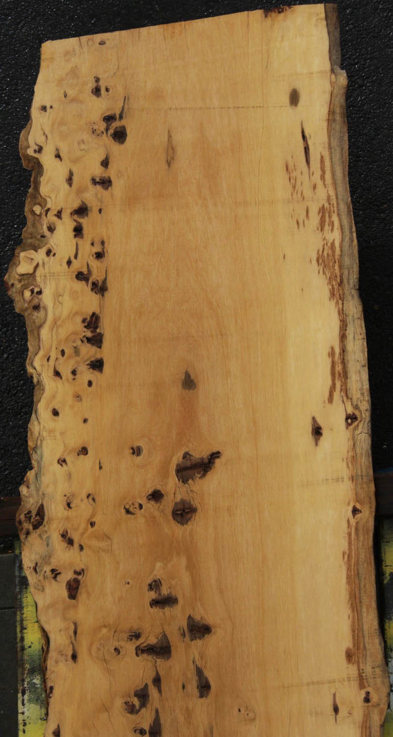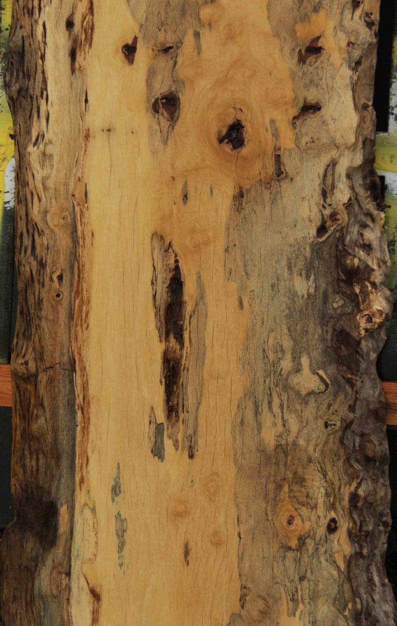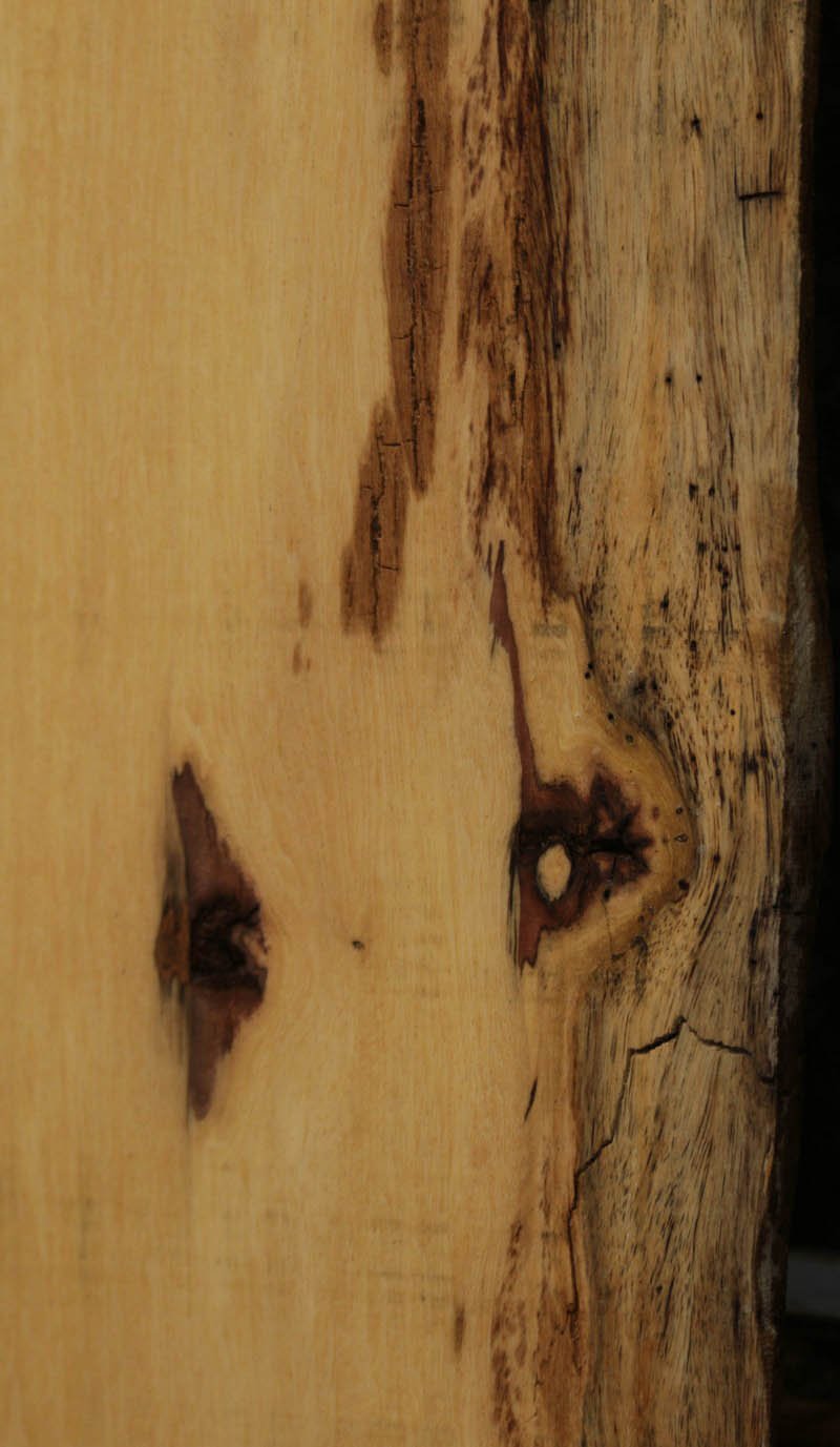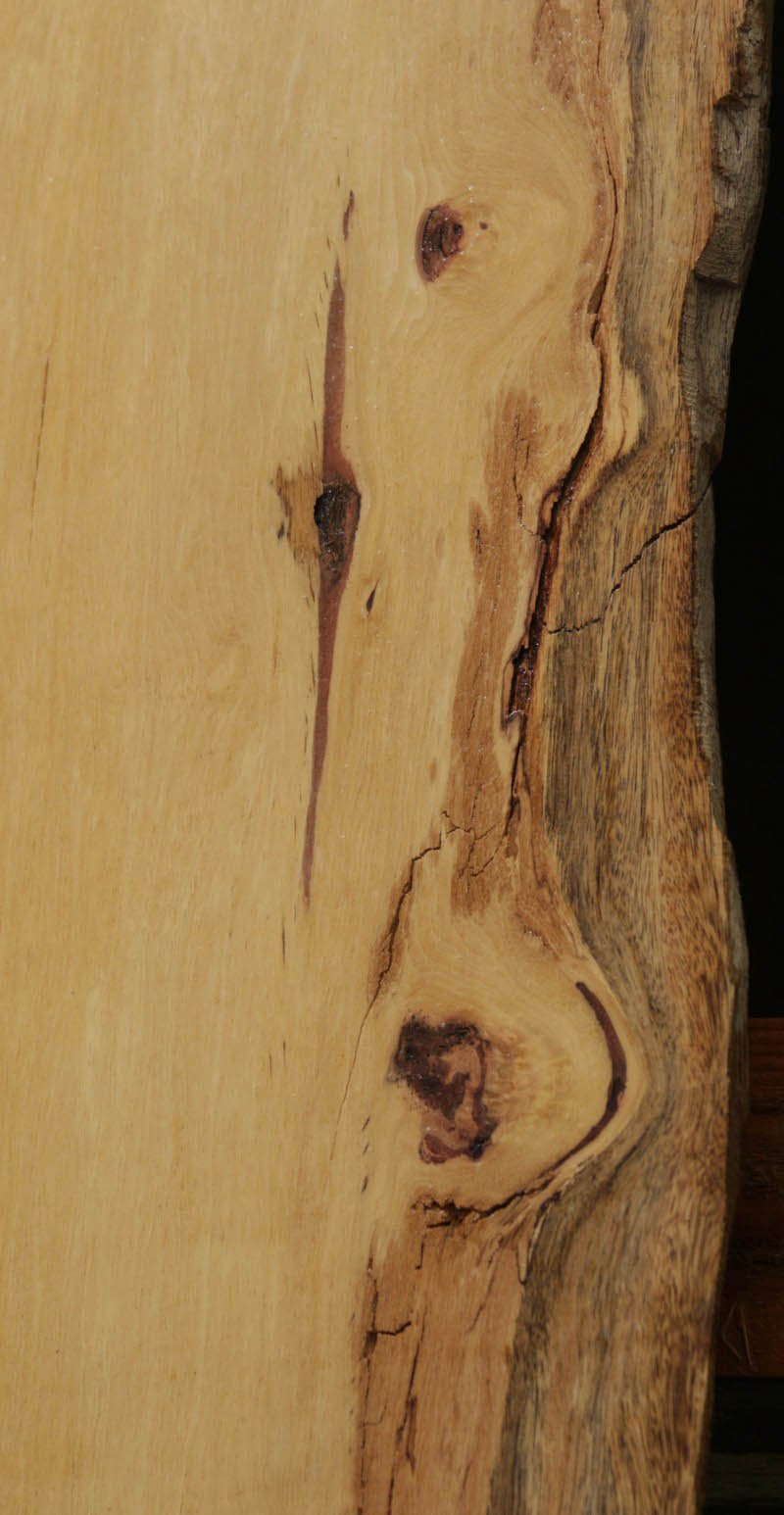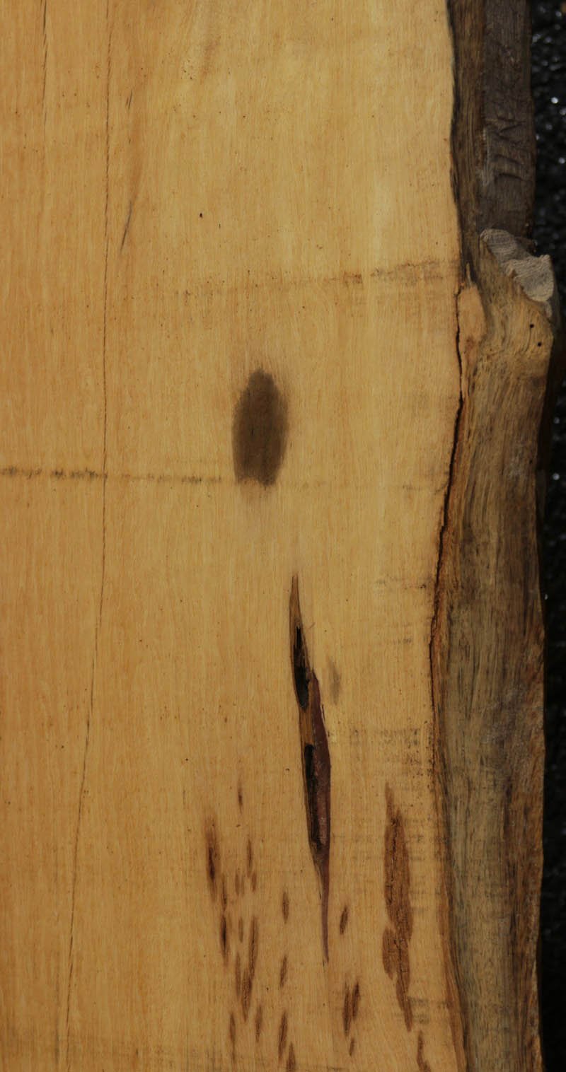 Piquiarana, a large, dense, South American hardwood, is ideally suited for a large table or bar top. Figured live edges add character and beauty to this unique species. This slab has been vacuum kiln dried and planed on two sides. There may be areas of minor planer hit/miss. Both faces contain inclusions. Drying checks and splits are present on both faces and ends. Specific gravity is 0.72, as compared to Walnut at 0.55, making this a very durable choice for a high traffic area. Enjoy creating a lovely project with this splendid South American beauty! Measures 109.2 Board Feet with an average width of 34.5". This piece has a beautiful live edge with figure present. There is a 1/8" twist, and there will be inclusions present as well as surface and end checks and splits. Epoxy resin will be needed to fill checks and voids. This item must be shipped freight.
