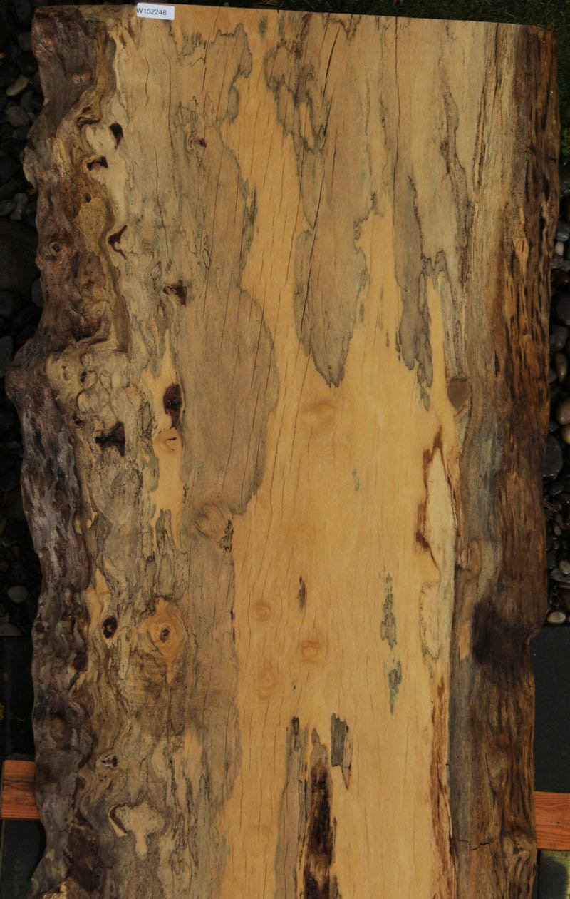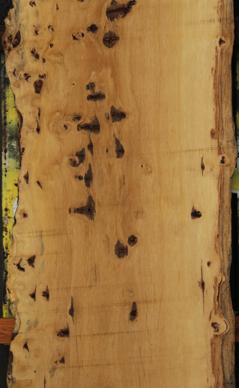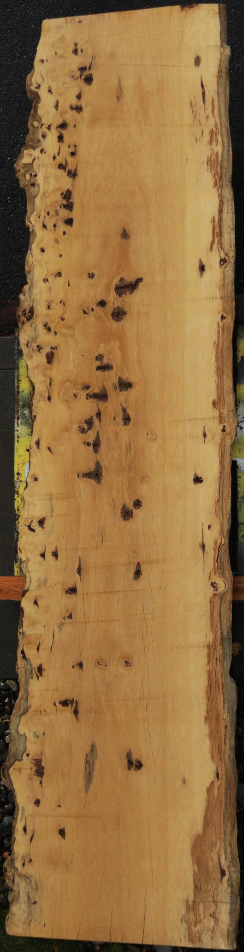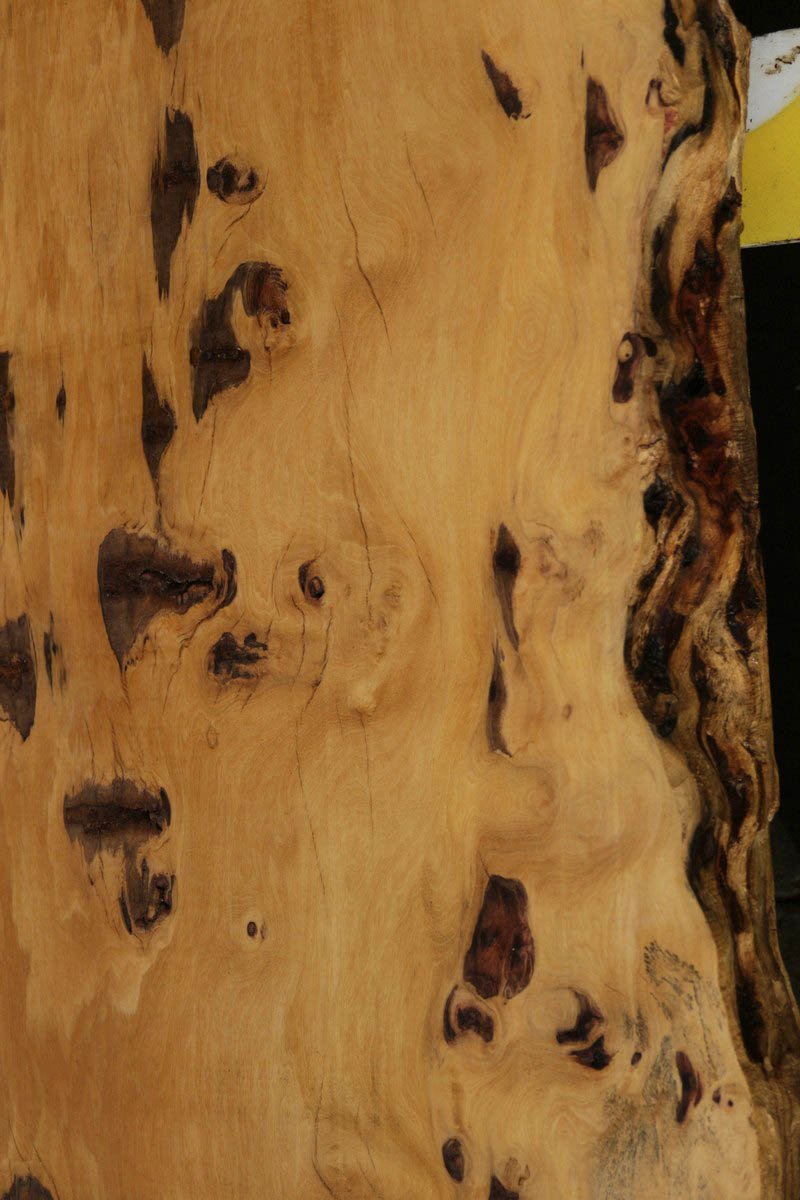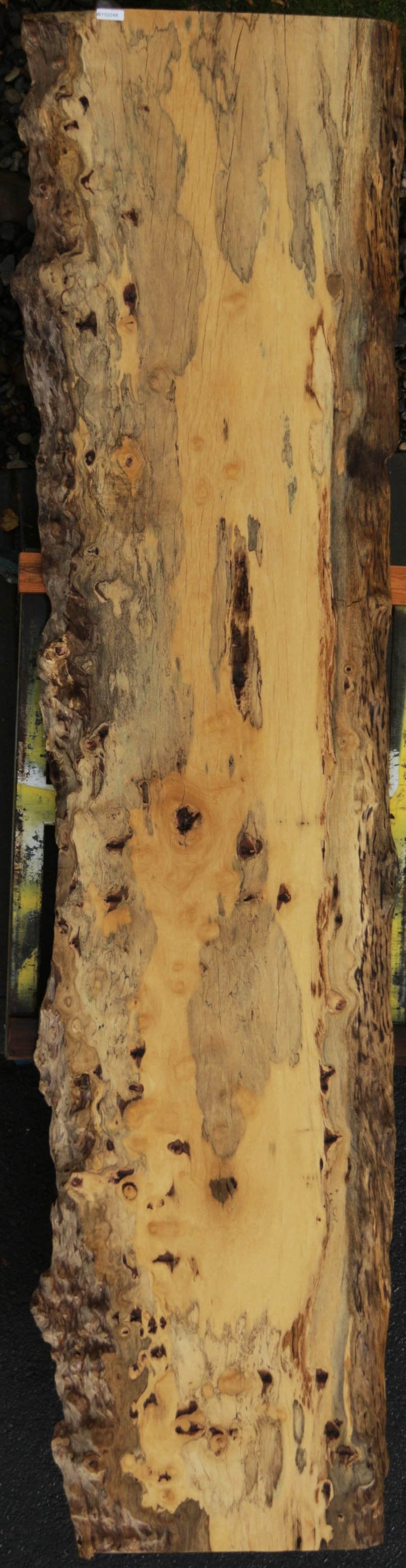 Piquiarana, a large, dense, South American hardwood, is ideally suited for a large table or bar top. Figured live edges add character and beauty to this unique species. This slab has been vacuum kiln dried and planed on two sides. There may be areas of minor planer hit/miss. Both faces contain inclusions. Drying checks and splits are present on both faces and ends. Specific gravity is 0.72, as compared to Walnut at 0.55, making this a very durable choice for a high traffic area. Enjoy creating a lovely project with this splendid South American beauty! Measures 109.2 Board Feet with an average width of 34.5". This piece has a beautiful live edge with figure present. There is a 1/8" twist, and there will be inclusions present as well as surface and end checks and splits. Epoxy resin will be needed to fill checks and voids. This item must be shipped freight.