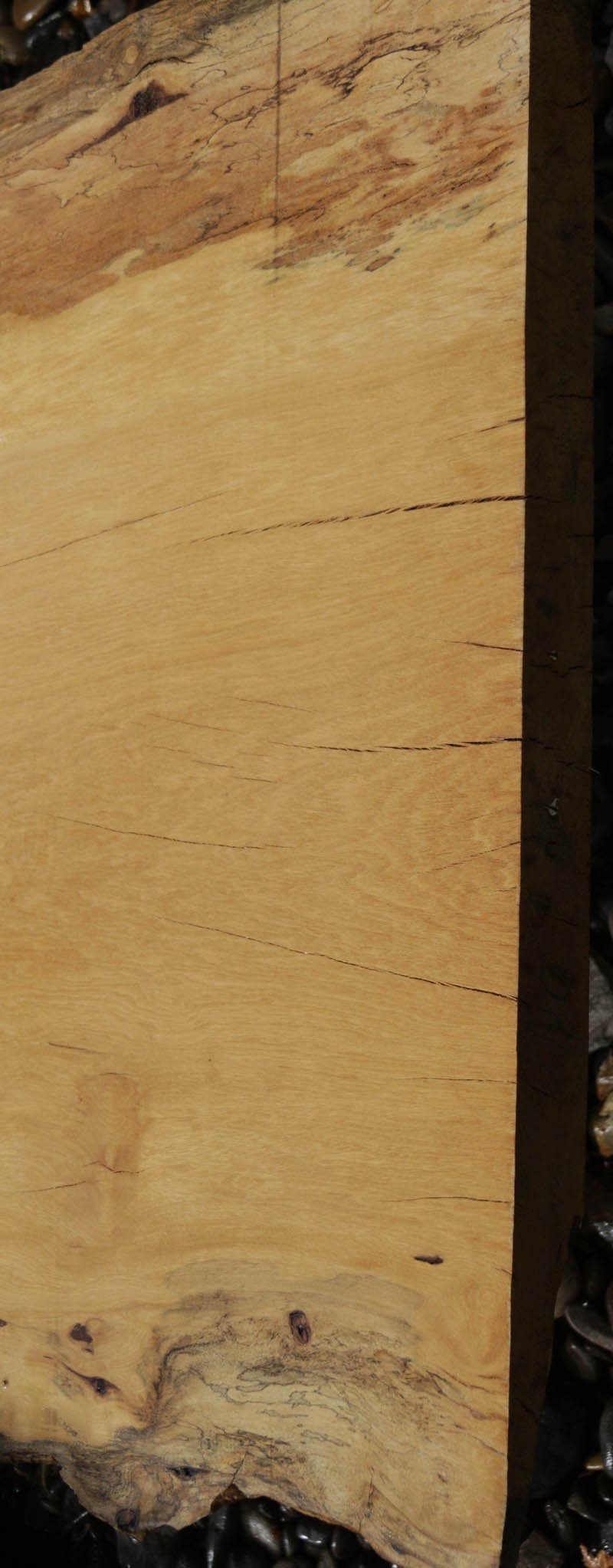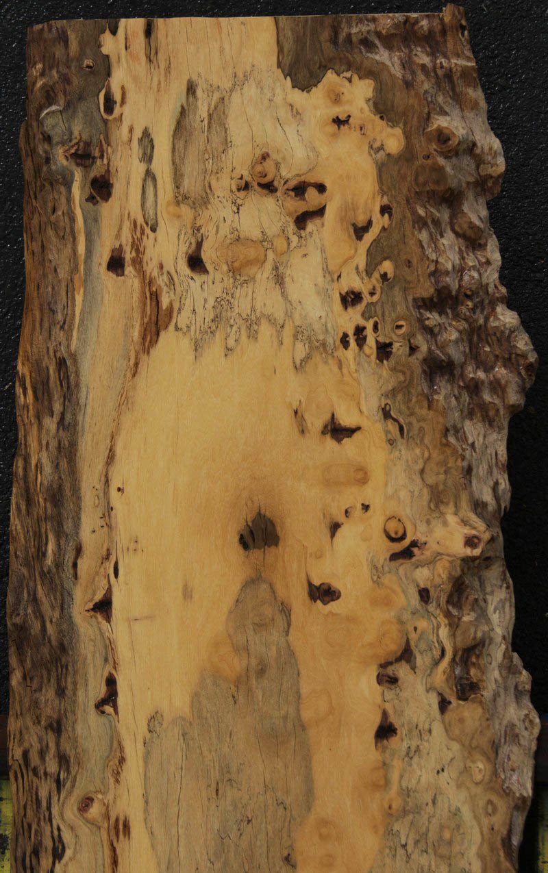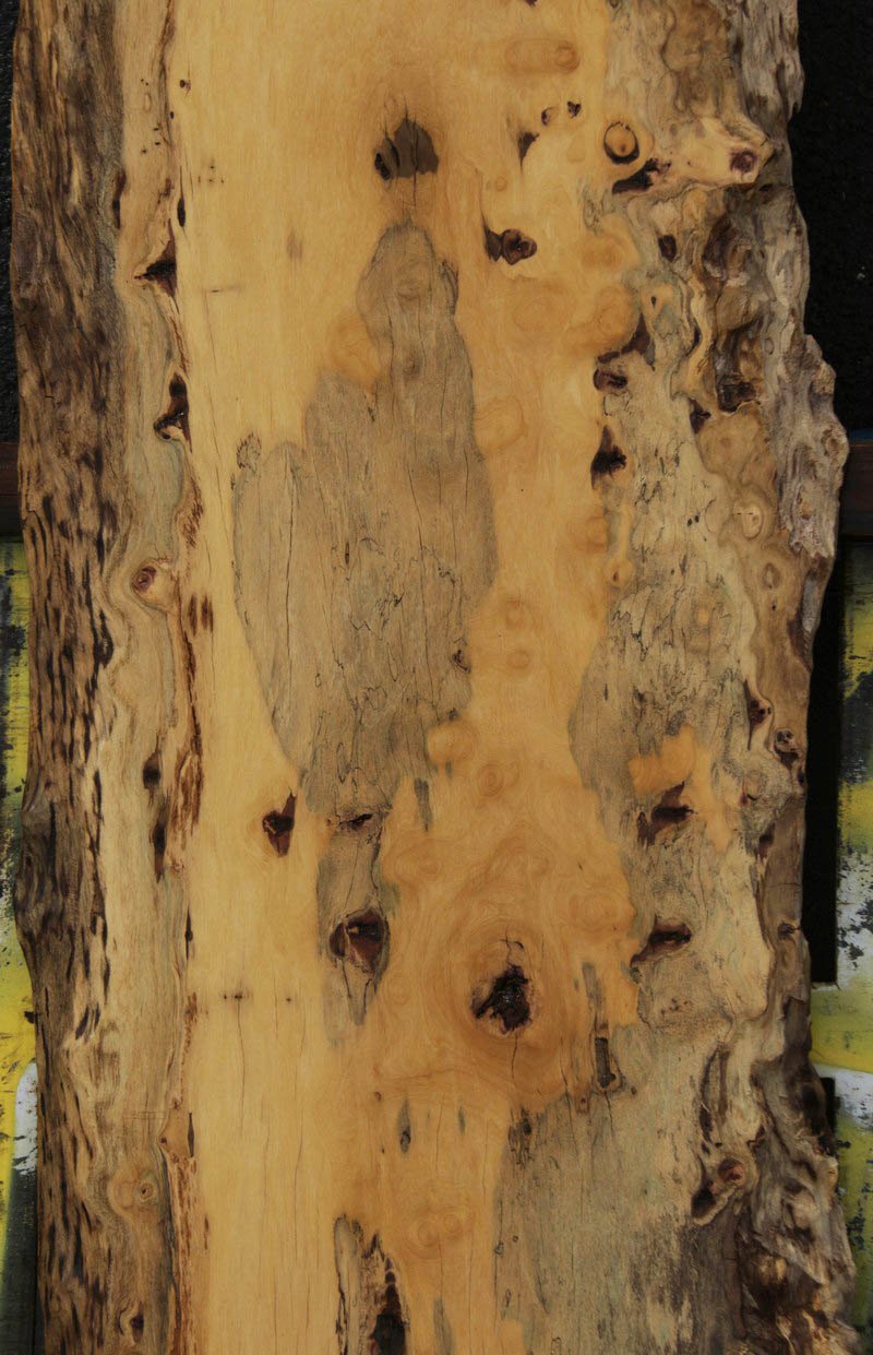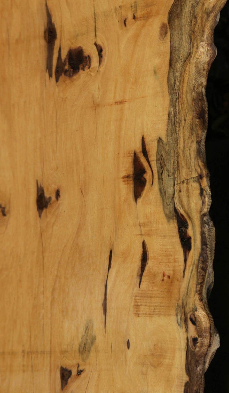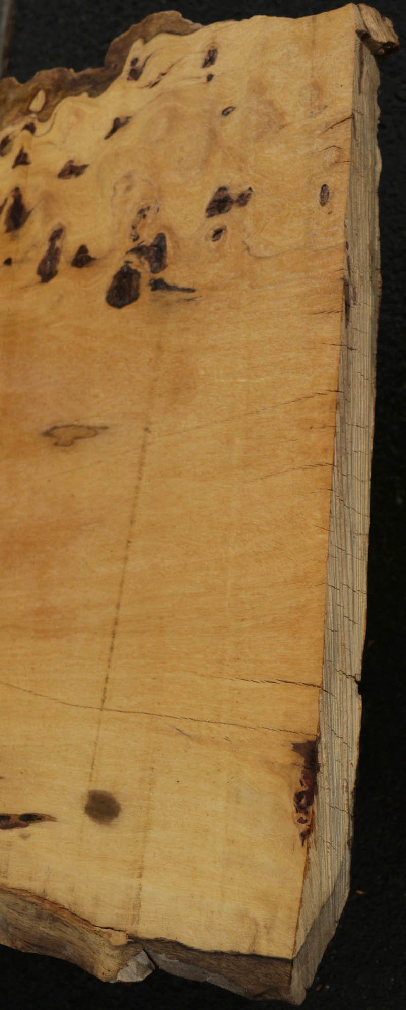 Piquiarana, a large, dense, South American hardwood, is ideally suited for a large table or bar top. Figured live edges add character and beauty to this unique species. This slab has been vacuum kiln dried and planed on two sides. There may be areas of minor planer hit/miss. Both faces contain inclusions. Drying checks and splits are present on both faces and ends. Specific gravity is 0.72, as compared to Walnut at 0.55, making this a very durable choice for a high traffic area. Enjoy creating a lovely project with this splendid South American beauty! Measures 109.2 Board Feet with an average width of 34.5". This piece has a beautiful live edge with figure present. There is a 1/8" twist, and there will be inclusions present as well as surface and end checks and splits. Epoxy resin will be needed to fill checks and voids. This item must be shipped freight.