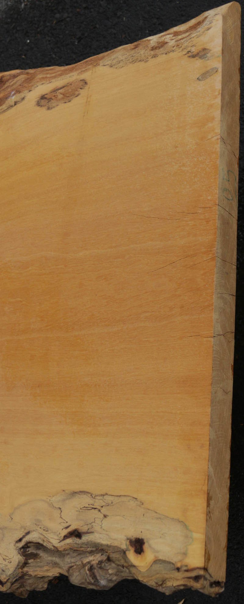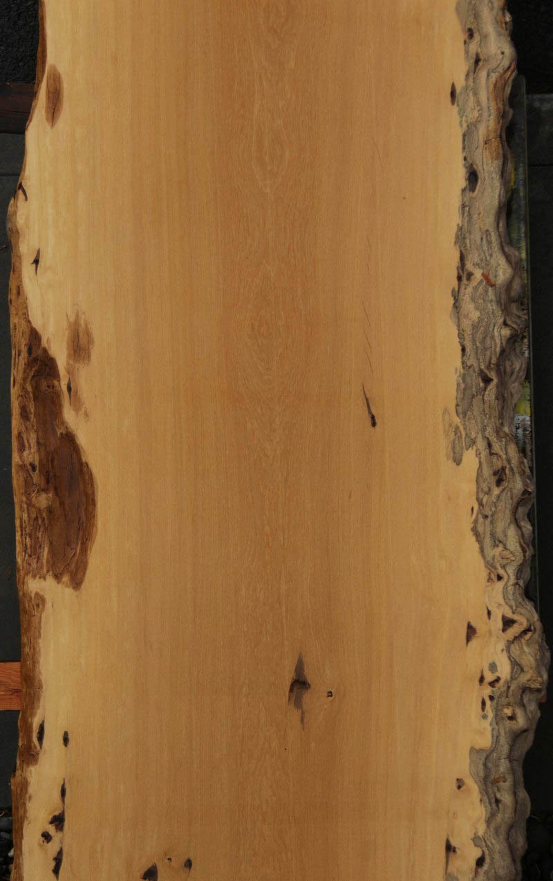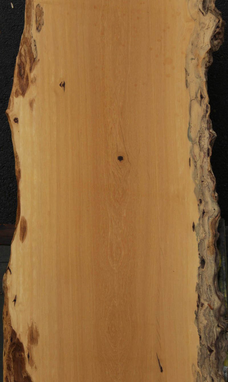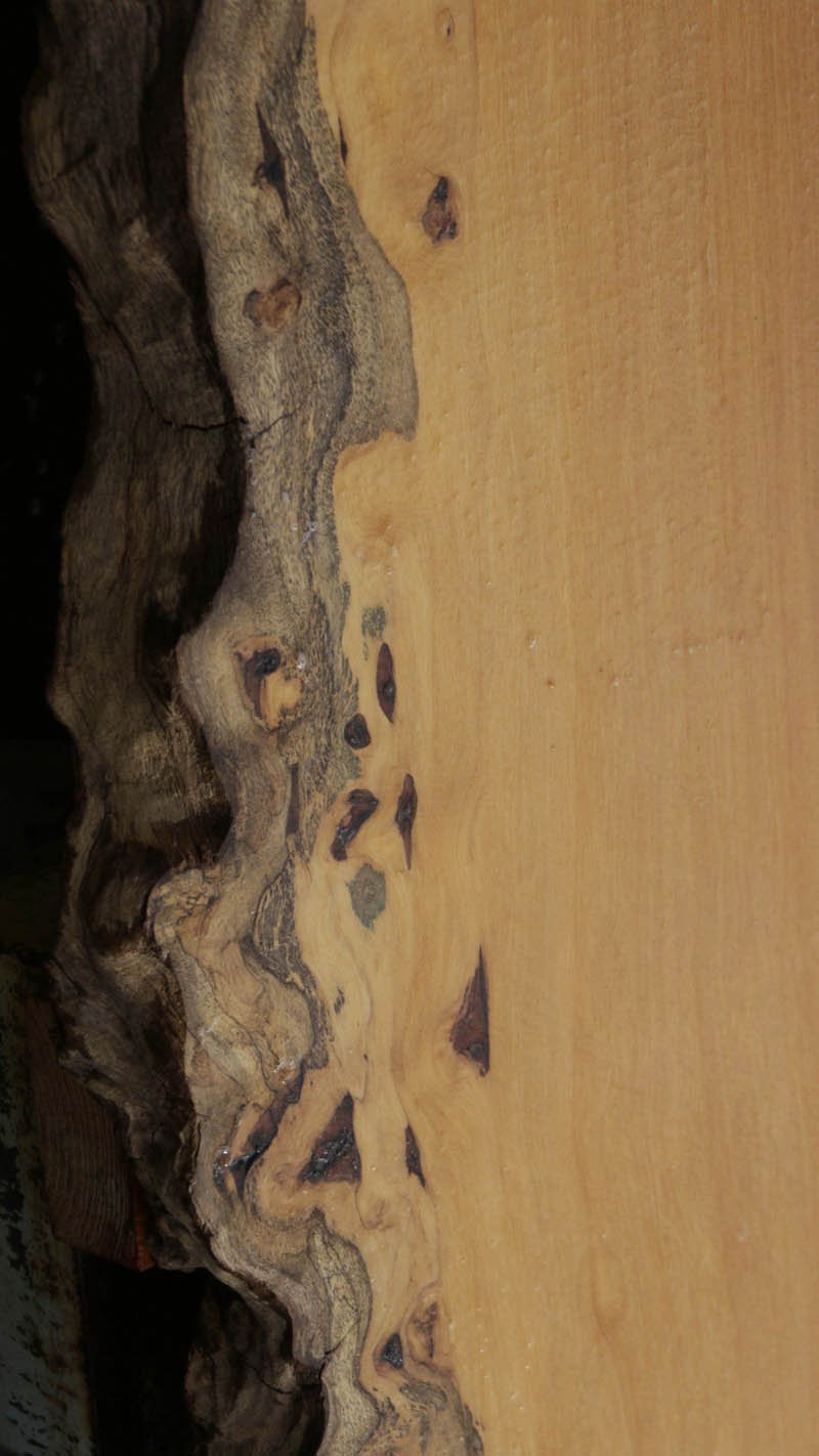 Piquiarana, a large, dense, South American hardwood, is ideally suited for a large table or bar top. Figured live edges add character and beauty to this unique species. This slab has been vacuum kiln dried and planed on two sides. There may be areas of minor planer hit/miss. Both faces contain inclusions. Drying checks and splits are present on both faces and ends. Specific gravity is 0.72, as compared to Walnut at 0.55, making this a very durable choice for a high traffic area. Enjoy creating a lovely project with this splendid South American beauty! Measures 80.2 Board Feet with an average width of 38" measured on the widest face. Spalted and figured live edge. This piece has a 1/8" bow with some checks on the faces. There will be inclusions present as well as surface end checks and splits. This piece also has internal checks. Epoxy resin will be needed to fill checks and voids. This item must be shipped freight.