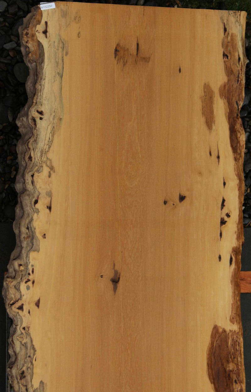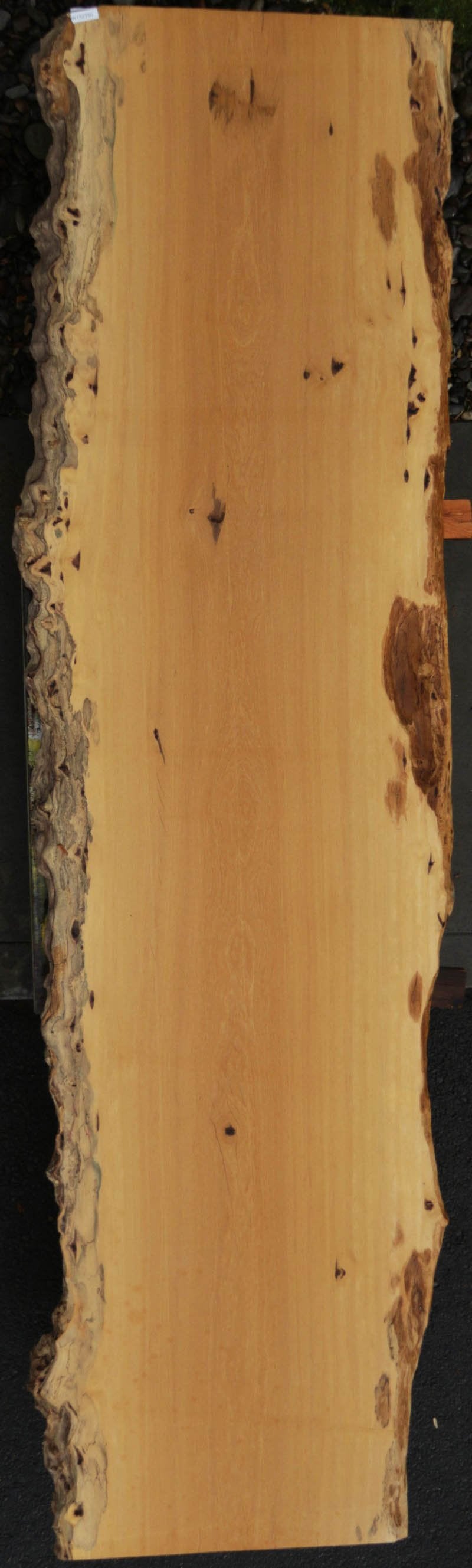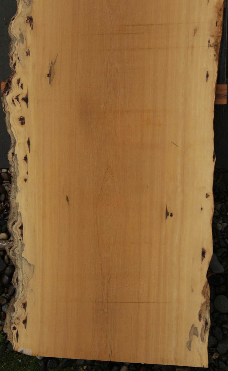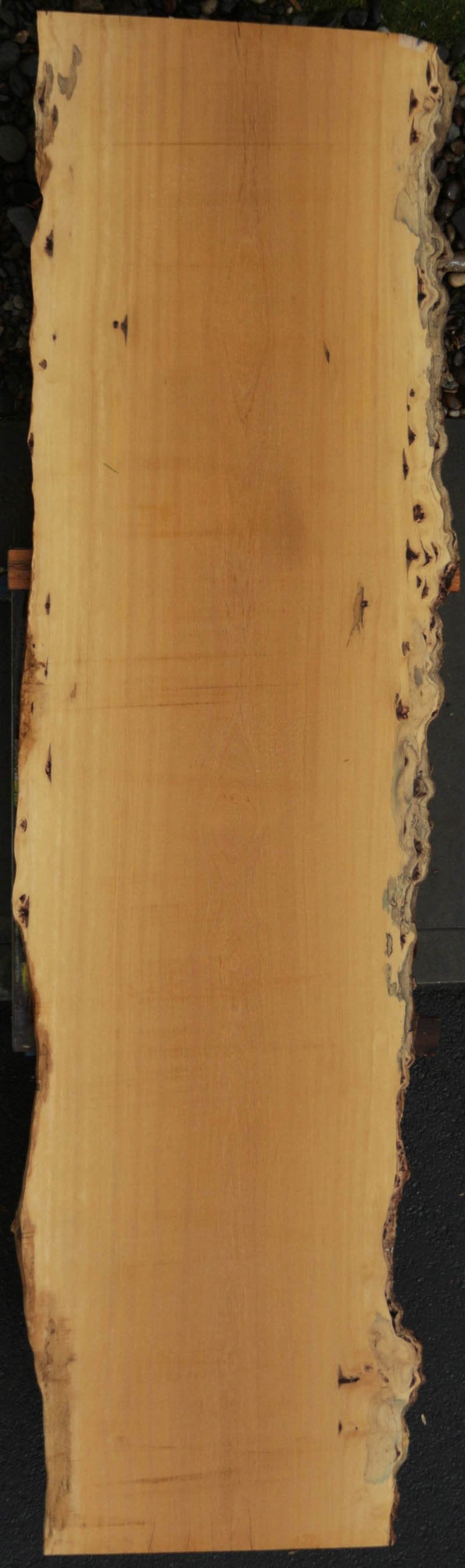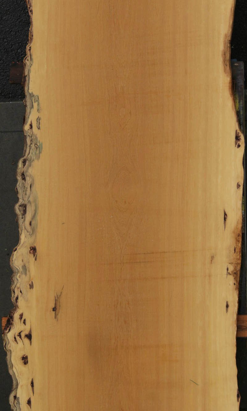 Piquiarana, a large, dense, South American hardwood, is ideally suited for a large table or bar top. Figured live edges add character and beauty to this unique species. This slab has been vacuum kiln dried and planed on two sides. There may be areas of minor planer hit/miss. Both faces contain inclusions. Drying checks and splits are present on both faces and ends. Specific gravity is 0.72, as compared to Walnut at 0.55, making this a very durable choice for a high traffic area. Enjoy creating a lovely project with this splendid South American beauty! Measures 80.2 Board Feet with an average width of 38" measured on the widest face. Spalted and figured live edge. This piece has a 1/8" bow with some checks on the faces. There will be inclusions present as well as surface end checks and splits. This piece also has internal checks. Epoxy resin will be needed to fill checks and voids. This item must be shipped freight.