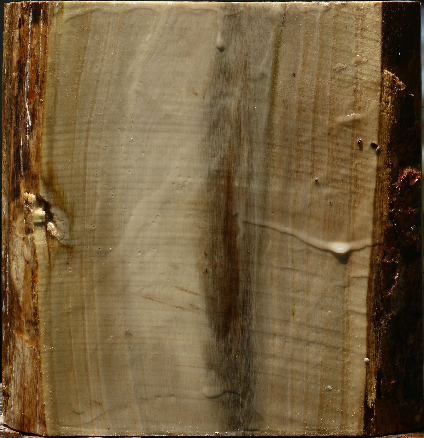 We've reclaimed this beautiful hardwood from orchards in California. Ranging from green to brown and red, these logs are the largest that we have ever had in 26 years! Pistachio is dense and turns to a high natural polish. This wood was freshly cut in May of 2025 and contains residual moisture. A minor end check or rough edge or live edge may be present. This material is fully wax sealed and is ideal for twice turning. Get yours before this high demand product sells out. This piece has a partial live edge. Please see pictures for details.