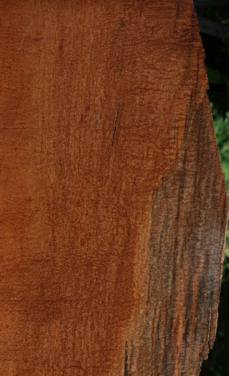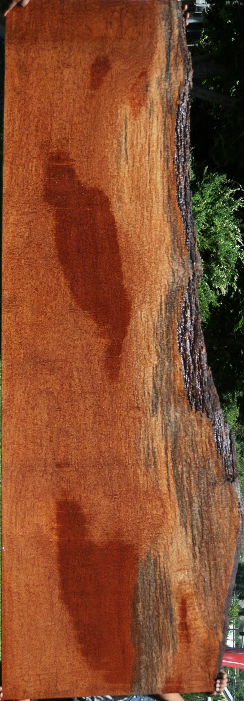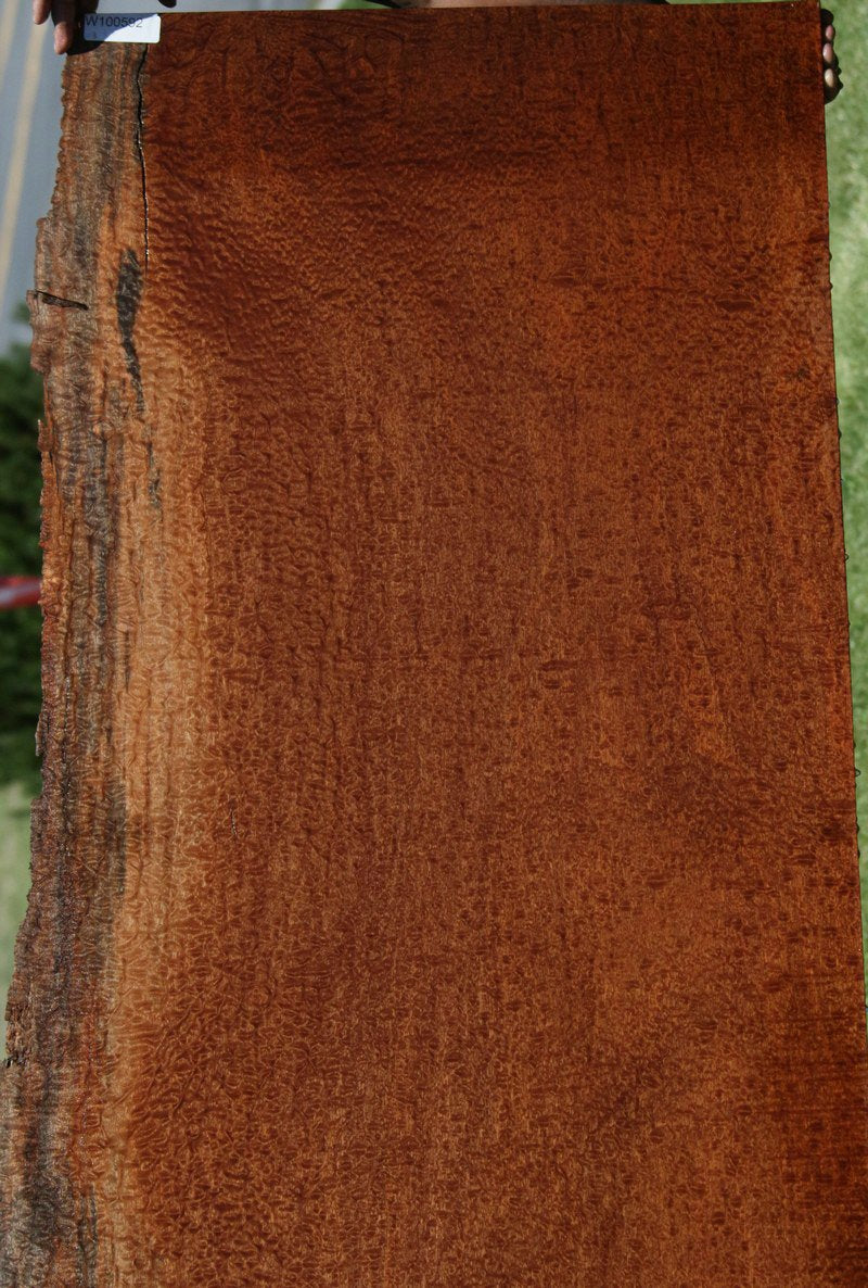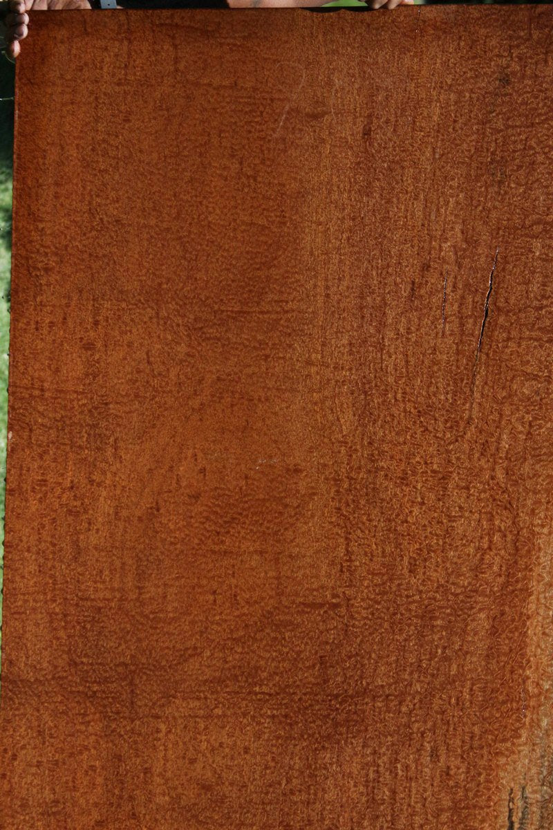 This exceptional African Sapele lumber is kiln dried, surfaced on two sides, and ready to use. Common uses for this high end material are guitars, ukuleles, and other fine woodworking projects such as furniture and boxes. A beautiful, tight “Pomelle” figure is present in most boards. This is the most figured Sapele lumber we’ve had in 20 years! If you are looking for something outstanding for your next exotic wood project, this African Sapele is an alluring choice! This slab has some planer skip on both faces, but mostly limited to the back face. It has a rustic live edge with checks and splits. About 80% of the slab could be used for guitars or itwould make a beautiful table or countertop! (This piece requires freight shipping due to its size. This item does not qualify for free shipping.)