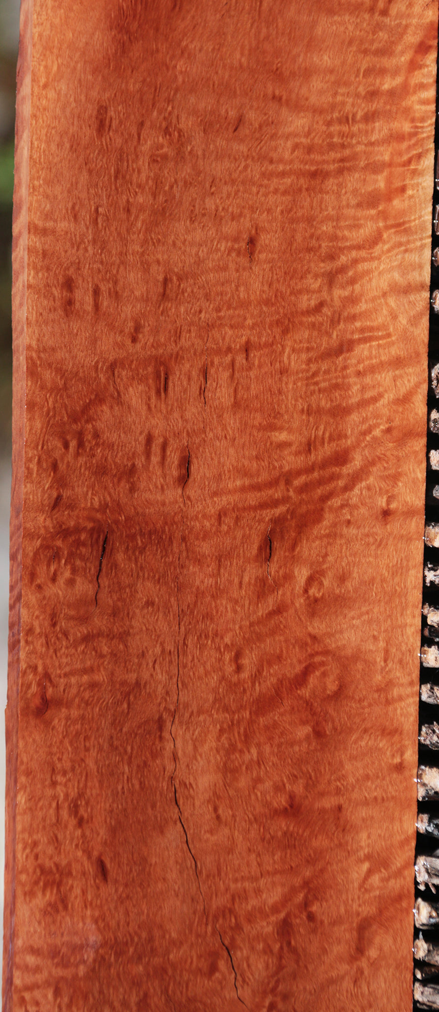 This tropical Rambutan lumber is kiln dried, surfaced on two sides and ready to use. A few minor checks, inclusions, or planer bite may be present. This wood is well figured and has rich, beautiful color. A 1/16" to 1/8" bow or twist may be present in boards over 36" in length. Rambutan is a dense hardwood that makes stunning woodworking projects! This piece has a partial live edge, checks, and inclusions. Please see pictures for details.