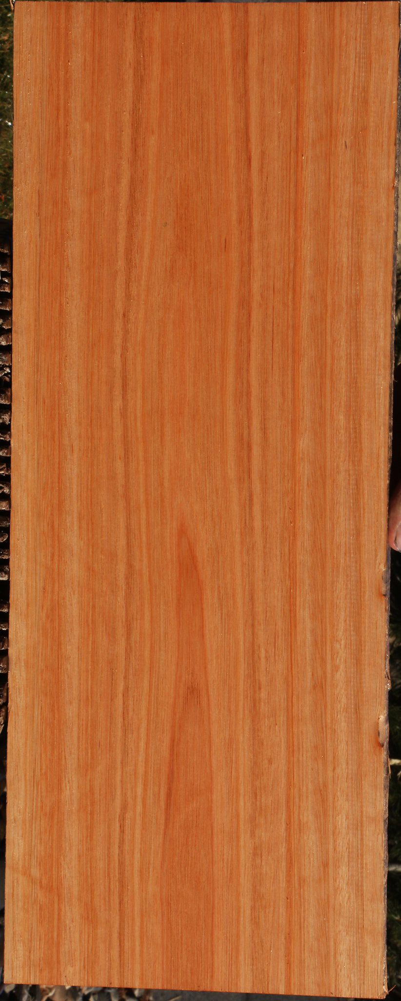 This Red Grandis wood is kiln dried, has been surfaced on two sides, and is ready to use. There may be an occasional small surface or end check present. Boards over 36" long may have a slight bow or twist up to 1/8". Some boards may have minor planer skip. Red Grandis is a unique, dense, and durable exotic hardwood that is sustainably plantation grown in Brazil. It works well, glues well, and finishes nicely. This piece has a partial rough edge. Please see pictures for details.