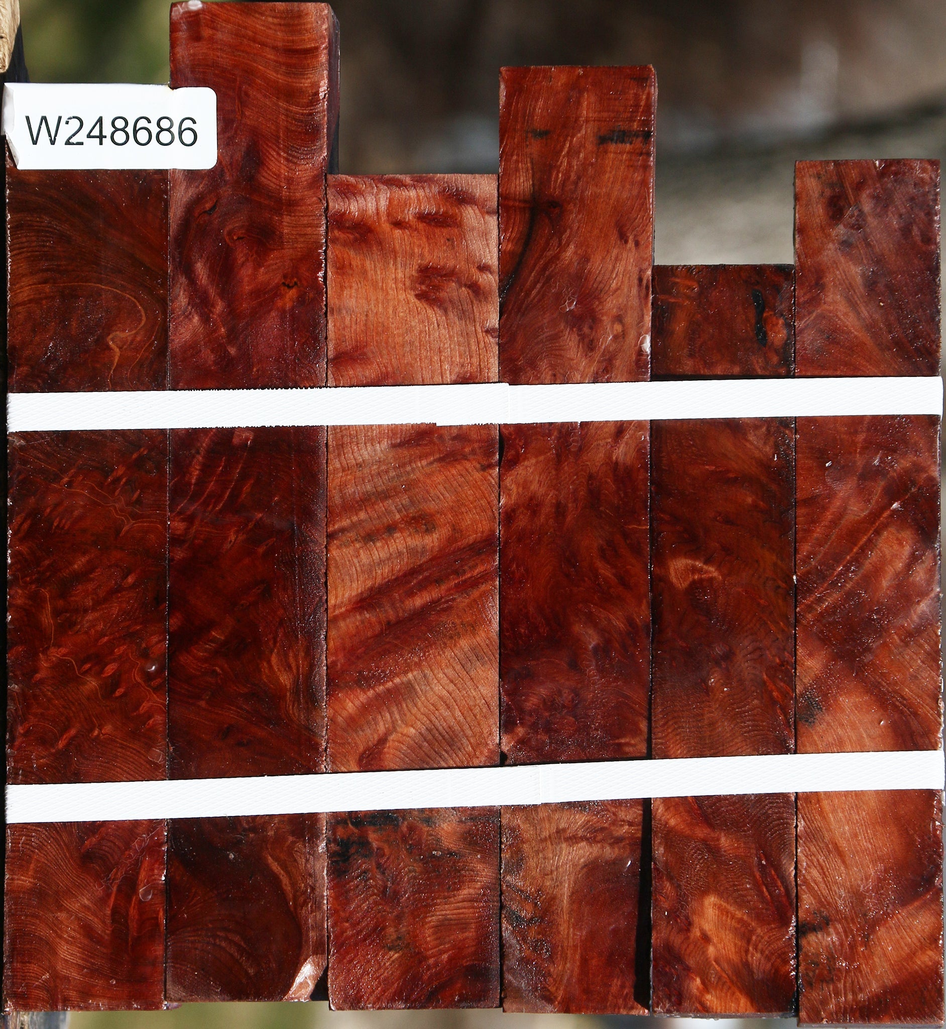 This salvaged Redwood lace burl was freshly cut in March 2025 and wax sealed. This wood comes from a tree that fell across a California highway in the winter of 2025 and was salvaged. It is ideal for twice turned bowls and other turned articles. Since it is from old growth stock and has very tight growth rings, it has great workability as well as fantastic mineral coloring! The wood cuts easily and glues well, making it a pleasure to work with. We're confident that you'll enjoy working this Pacific Northwest gem. Inclusions and occasional minor checking or rough corner edges may be present. This is a 6-piece set. The measurements above are for the shipping size. This pack contains pieces of different sizes. The longest piece measures 12-3/16" x 1-15/16" x 1-7/8". The shortest piece measures 9-1/8" x 1-3/4" x 1-3/4".