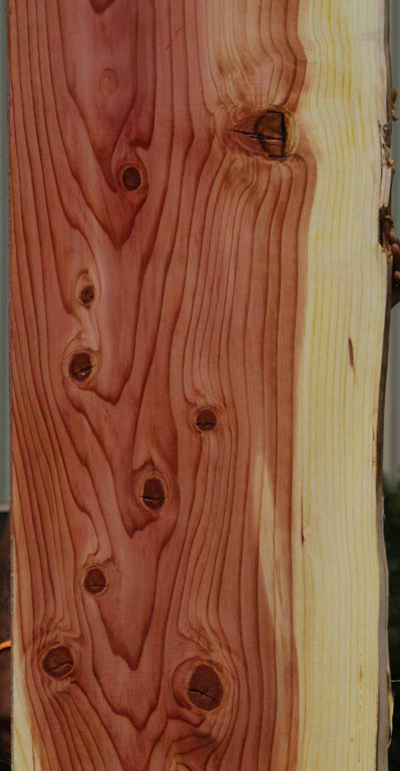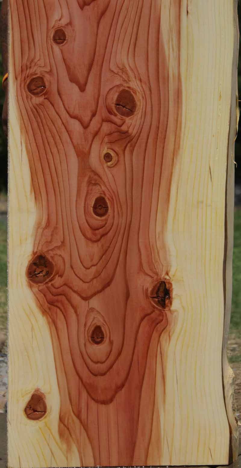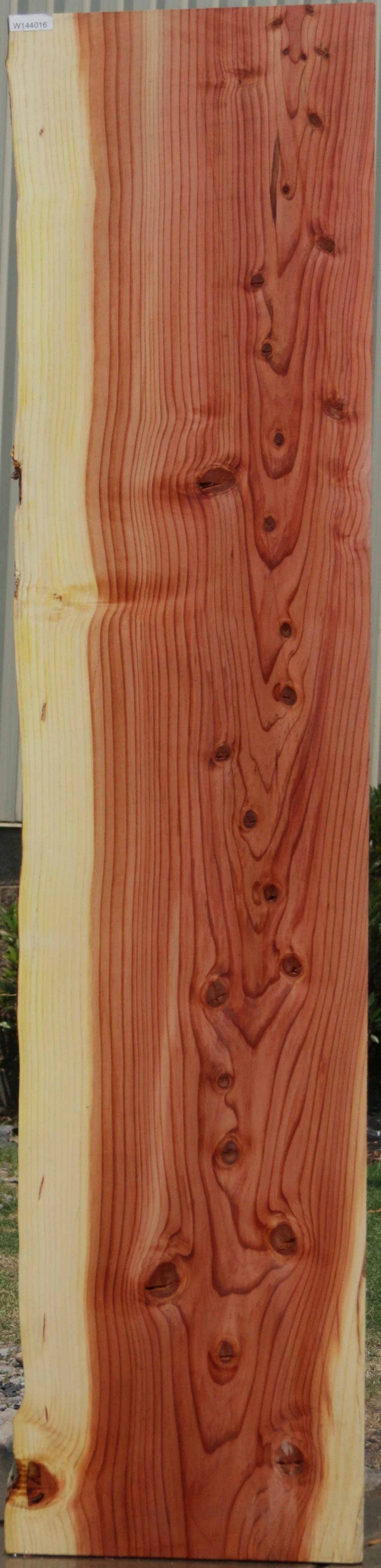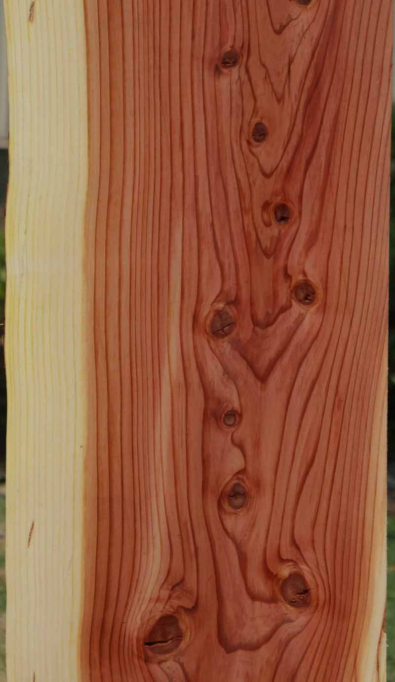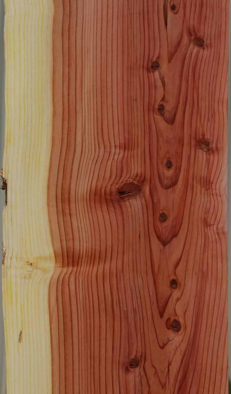 Giant Sequoia, Sequoiadendron giganteum, is the most massive tree on earth. It grows naturally in a very small area of California that ranges 260 miles by 15 miles wide in the Sierra Nevadas. All of the Sequoia that we cut is from trees that were planted in cities and houses. None of the wood is from the wild forests. Sequoia is light and cuts easily. Colors are hues of pink/red and purple and the sapwood is a clear white. This piece has checks in most of the sound knots and has two machine marks on the live edge. We could hand profile the machine marks out for $50,This piece would make a good countertop or bartop!