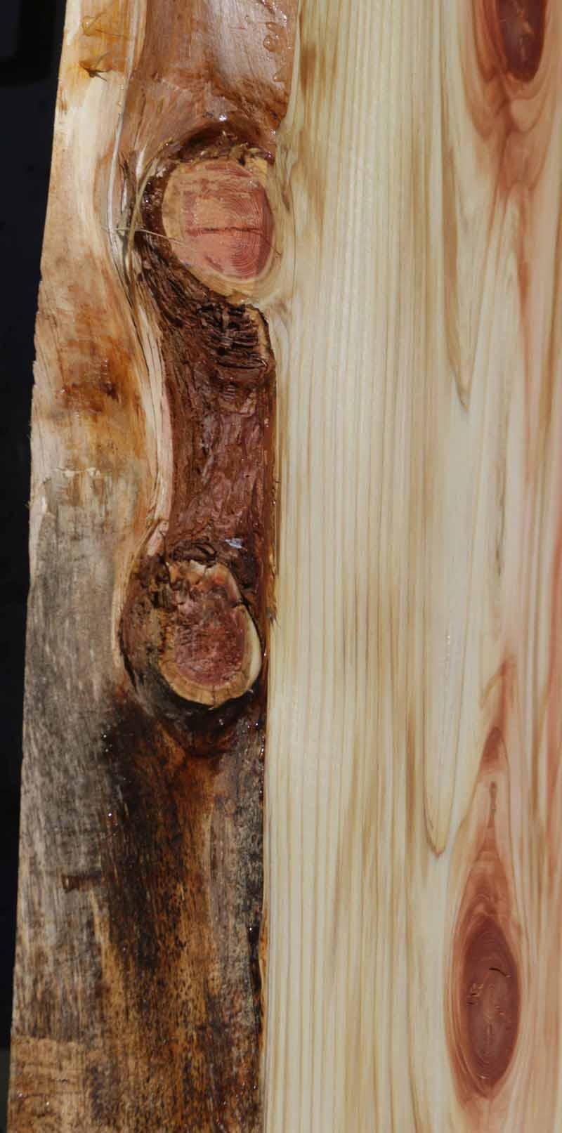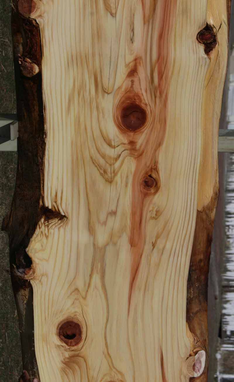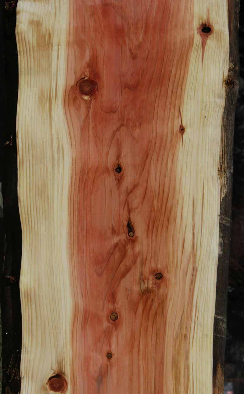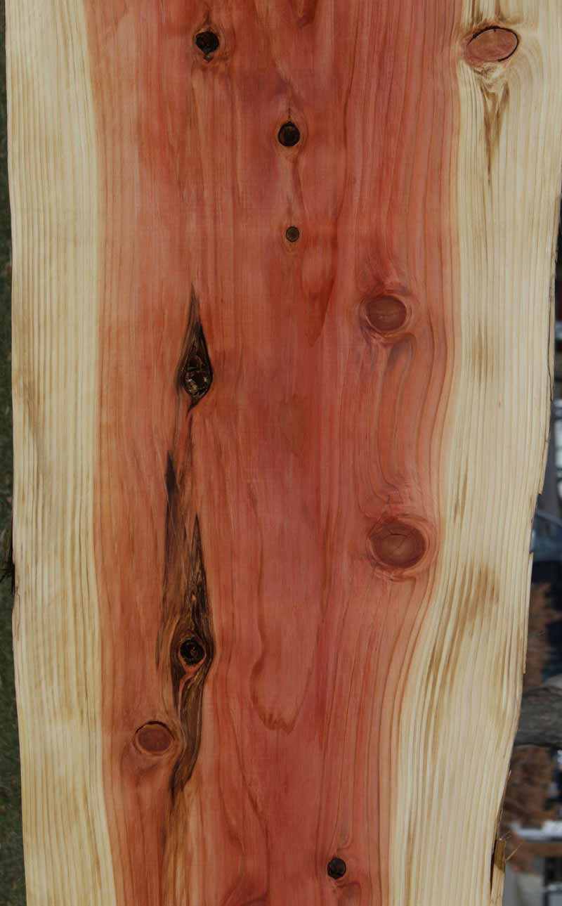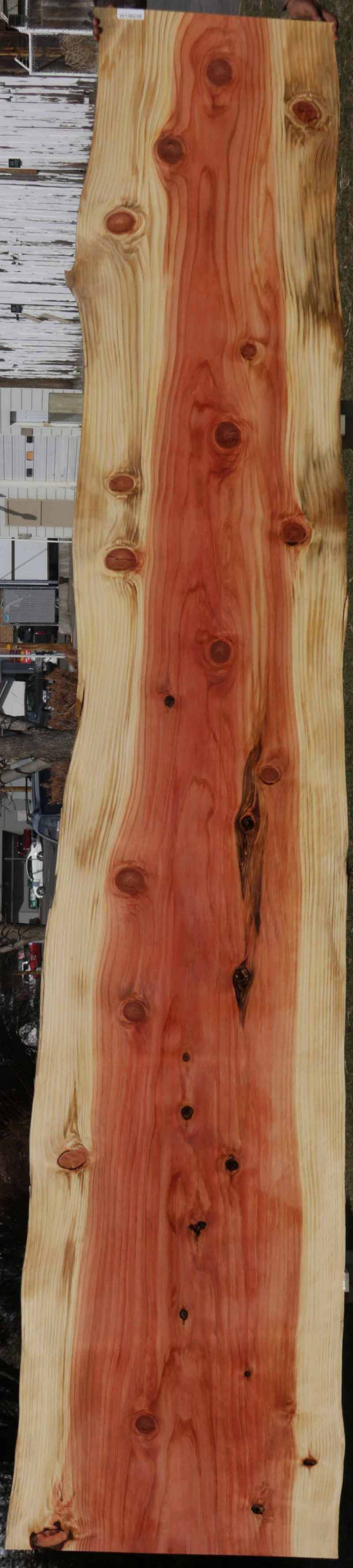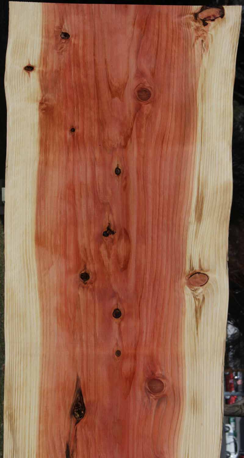 This Sequioa has a beautiful pinkish-red colors with light white sapwood. This material has been kiln dried and surfaced on two sides. This slab has knots present. There are some checks and splits in the knots. The live edges are rough. This is suitable for a bar top or counter top!