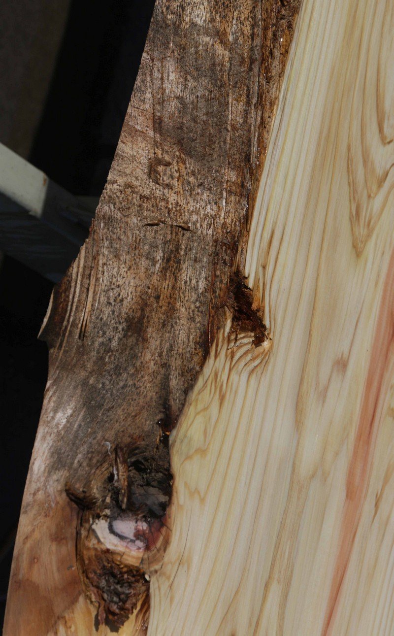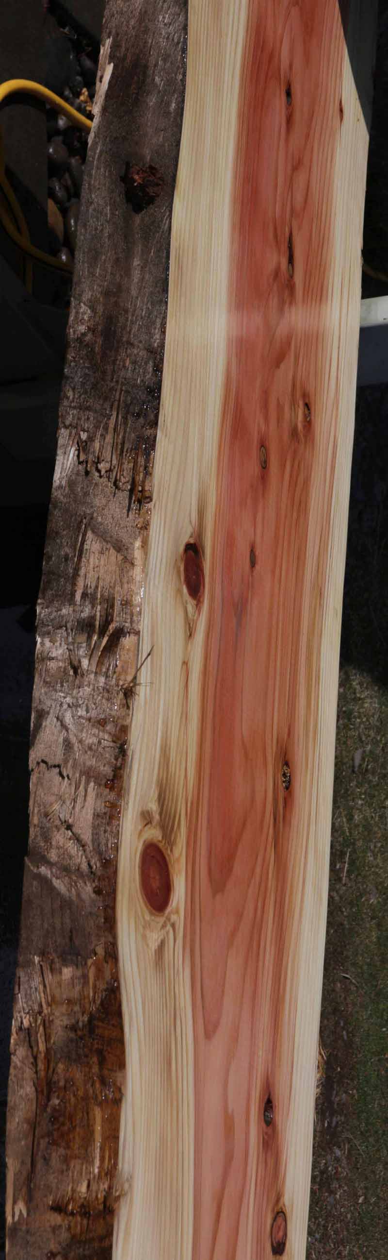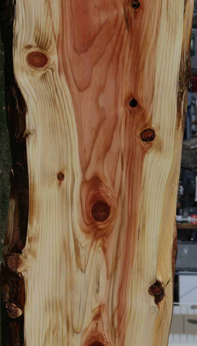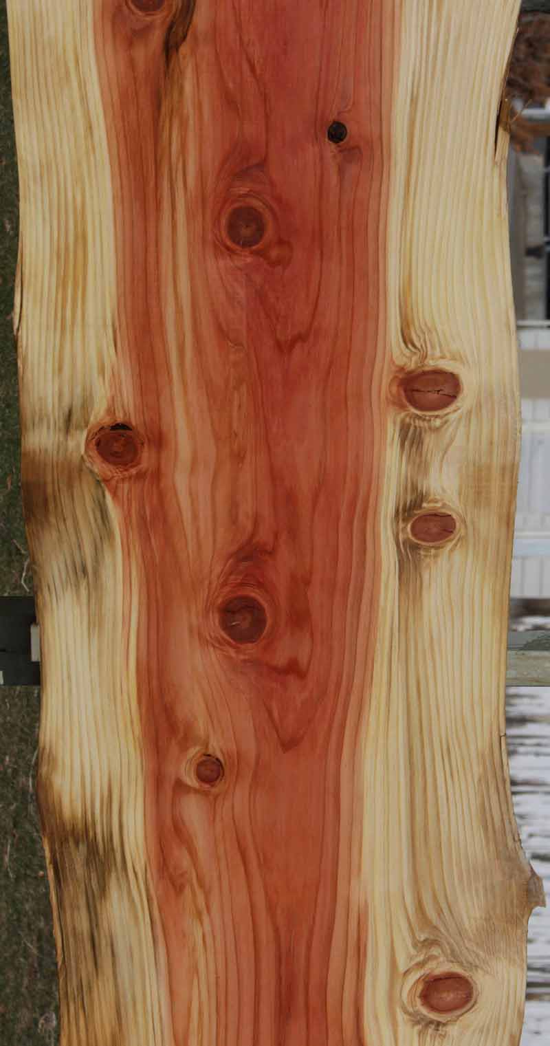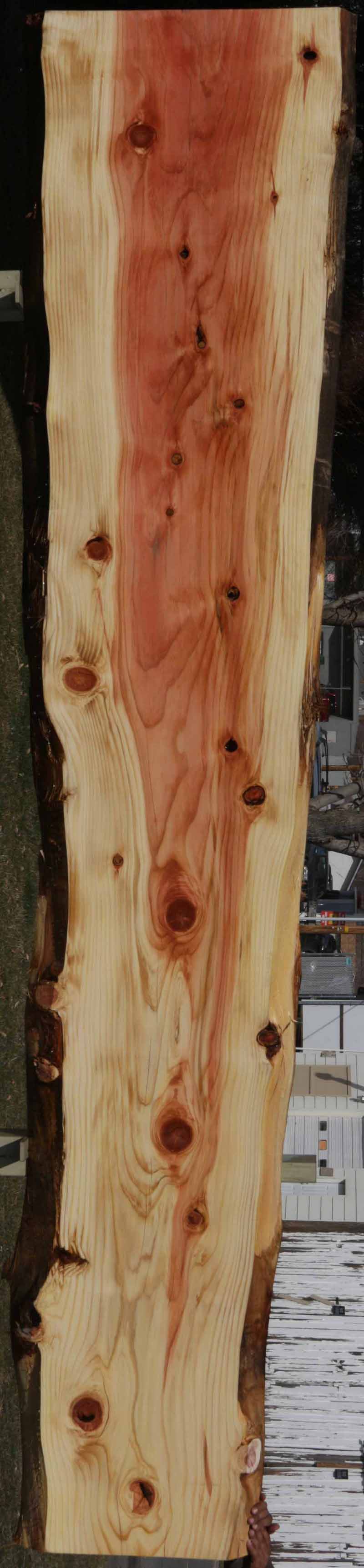 This Sequioa has a beautiful pinkish-red colors with light white sapwood. This material has been kiln dried and surfaced on two sides. This slab has knots present. There are some checks and splits in the knots. The live edges are rough. This is suitable for a bar top or counter top!