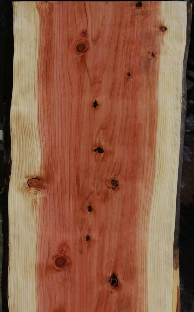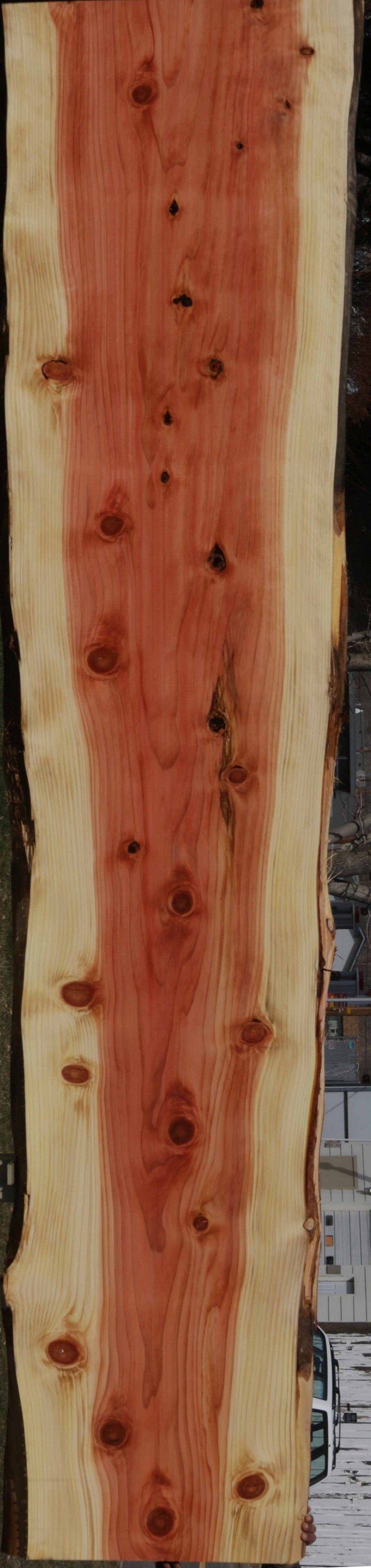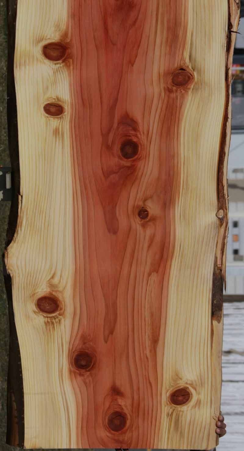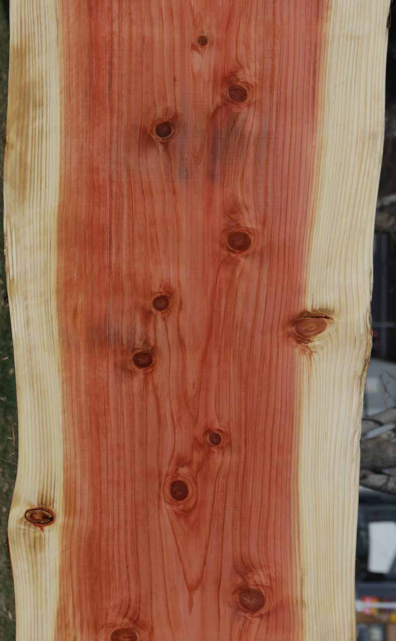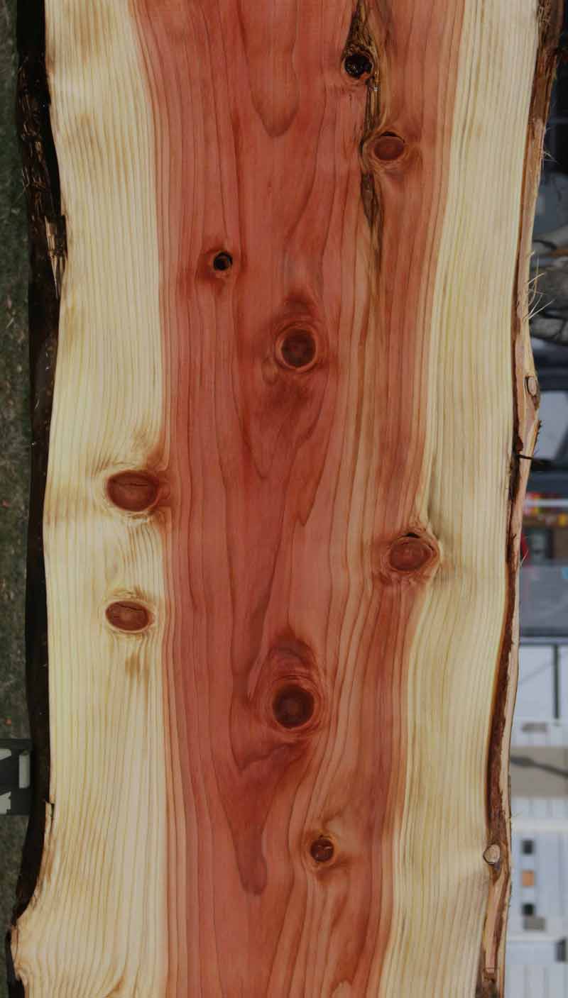 This Sequioa has a beautiful pinkish-red colors with light white sapwood. This material has been kiln dried and surfaced on two sides. This slab has knots present. There are some checks and splits in the knots. The live edges are rough. This is suitable for a bar top or counter top!