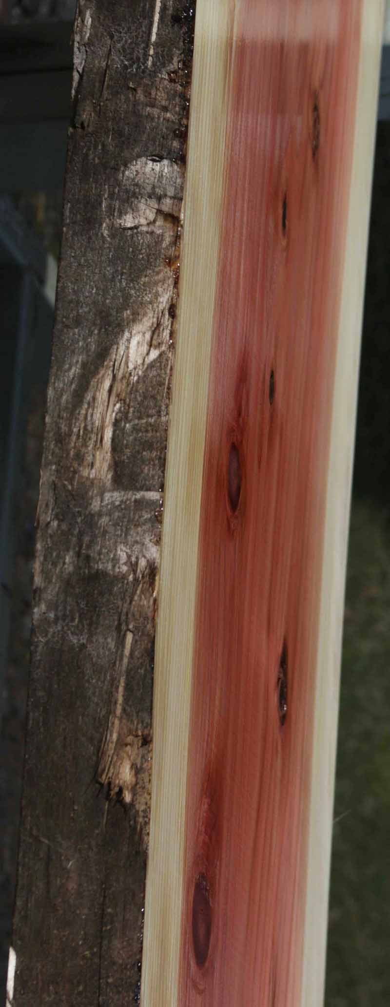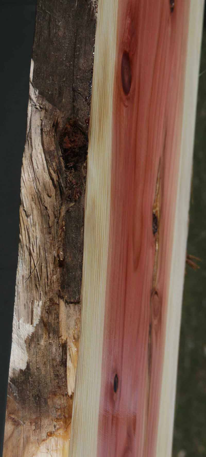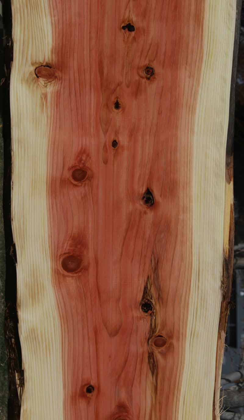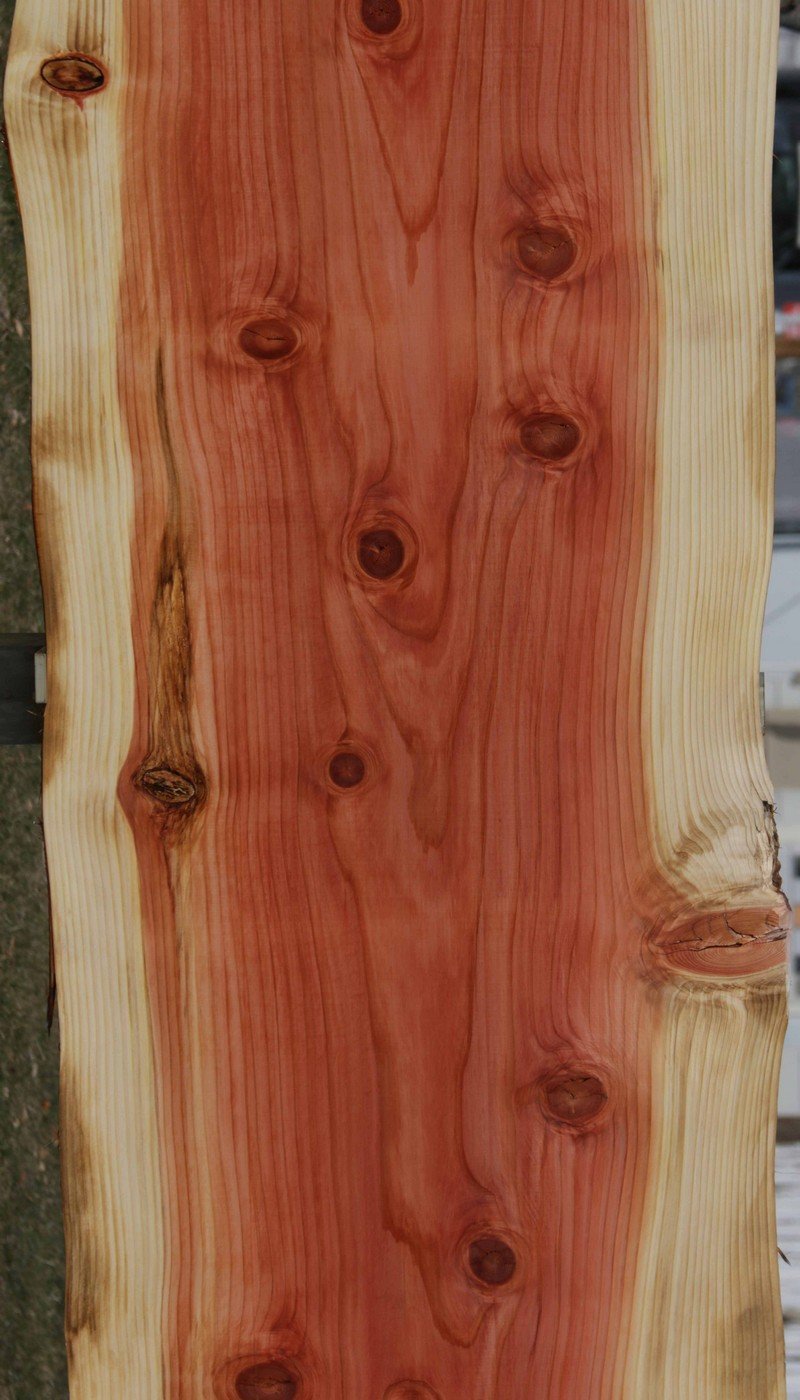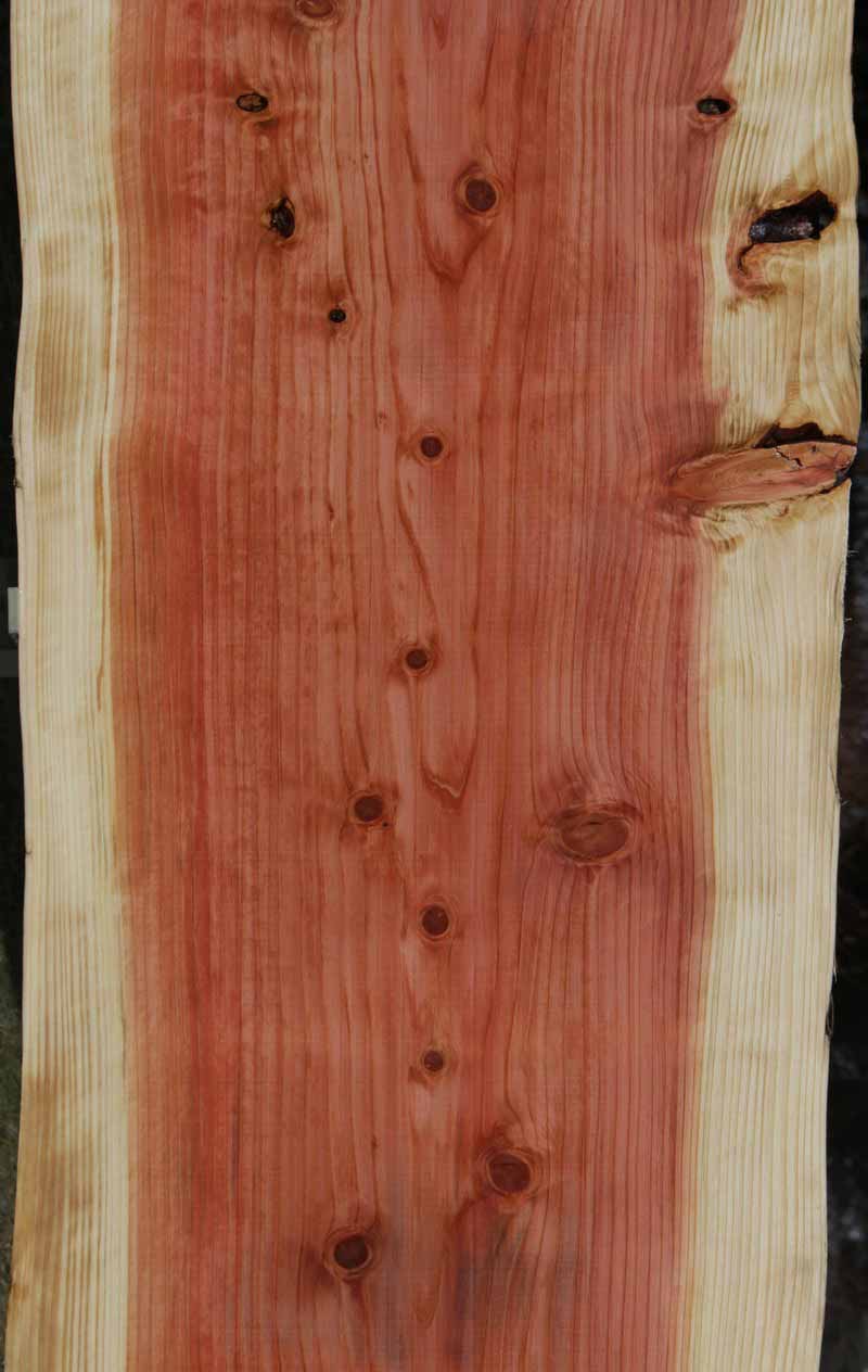 This Sequioa has a beautiful pinkish-red colors with light white sapwood. This material has been kiln dried and surfaced on two sides. This slab has knots present. There are some checks and splits in the knots. The live edges are rough. This is suitable for a bar top or counter top!