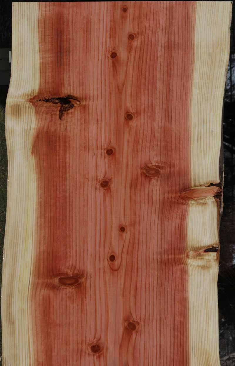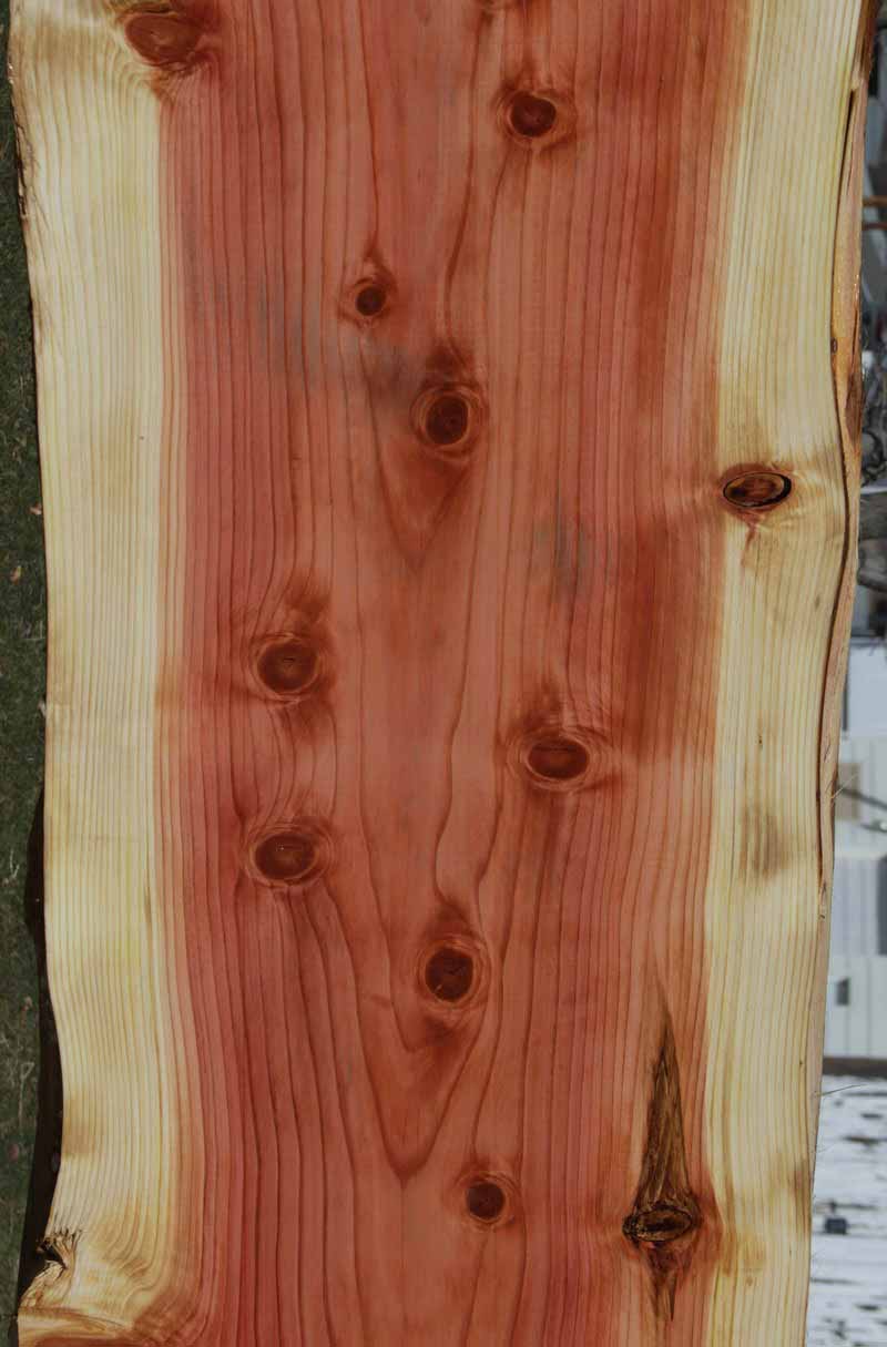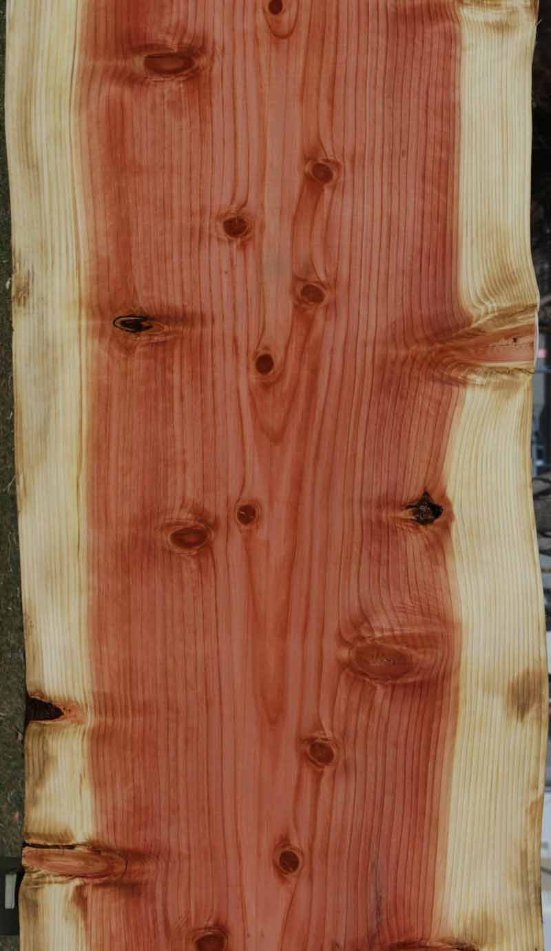 This Sequioa has a beautiful pinkish-red colors with light white sapwood. This material has been kiln dried and surfaced on two sides. This slab has knots present. There are some checks and splits in the knots. The live edges are rough.