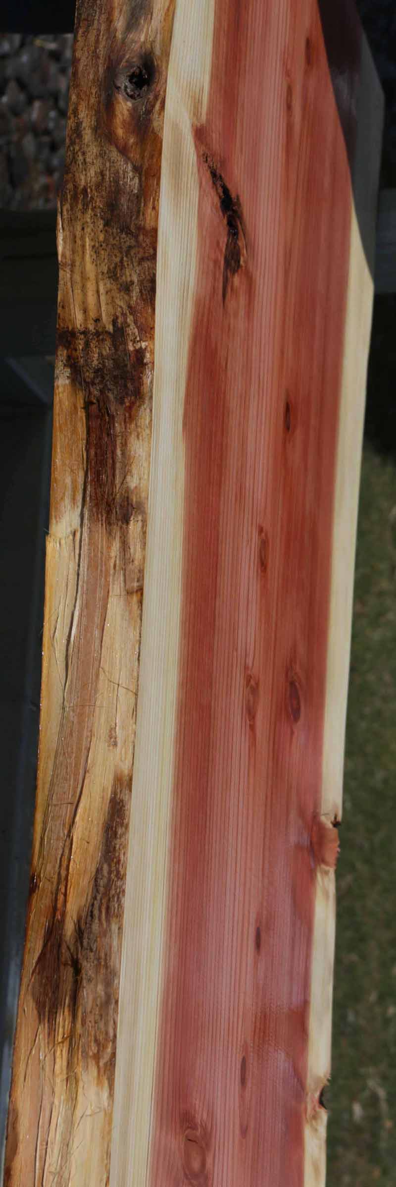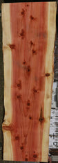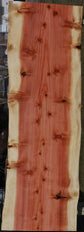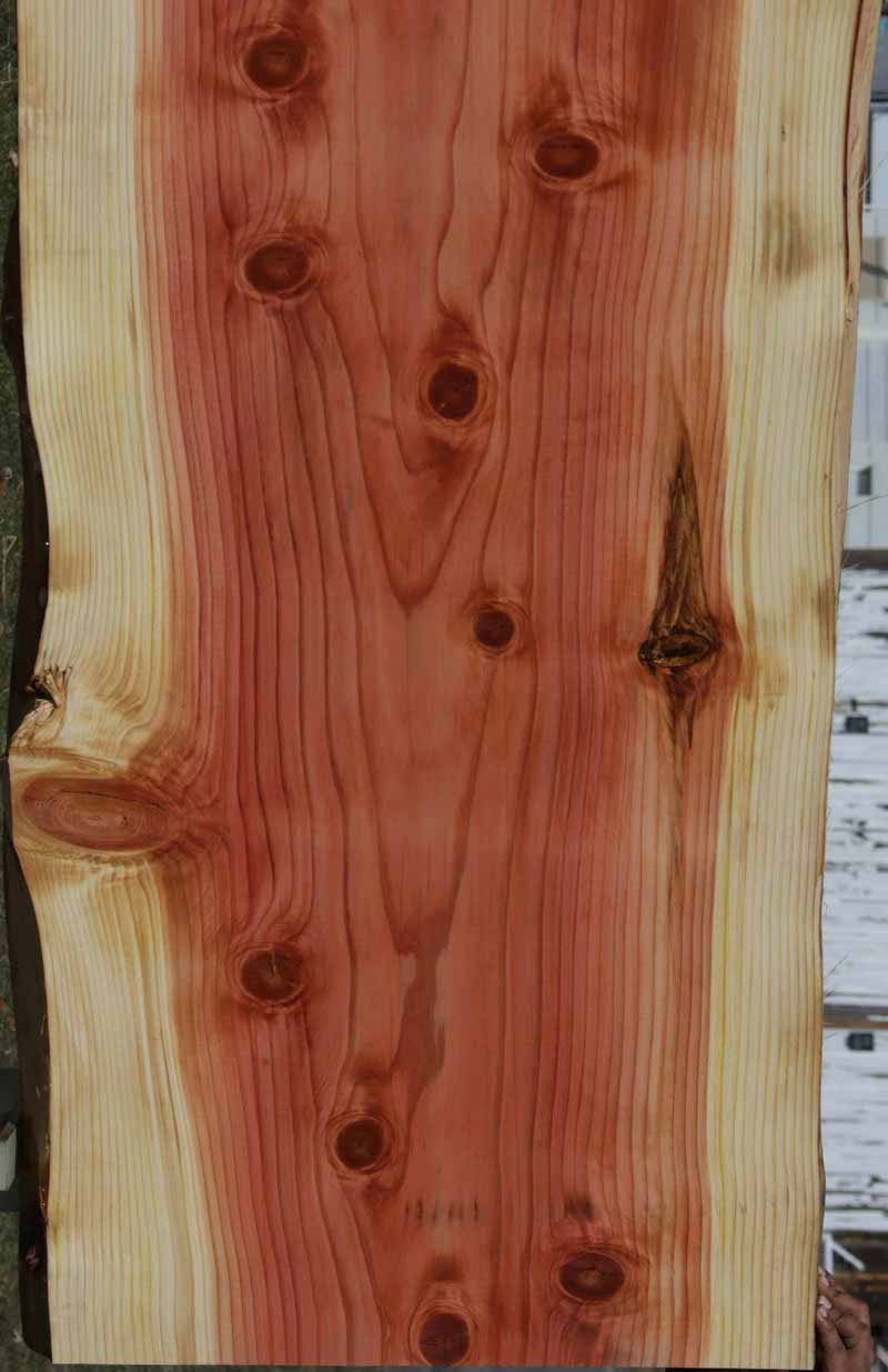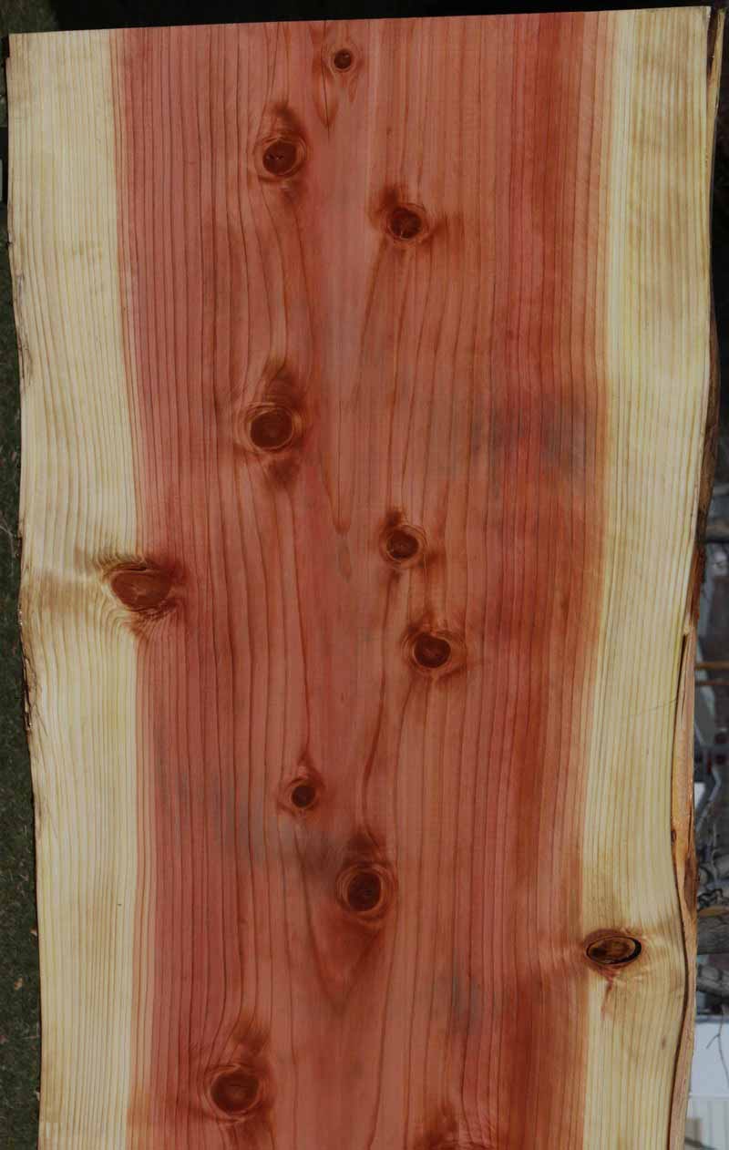 This Sequioa has a beautiful pinkish-red colors with light white sapwood. This material has been kiln dried and surfaced on two sides. This slab has knots present. There are some checks and splits in the knots. The live edges are rough.