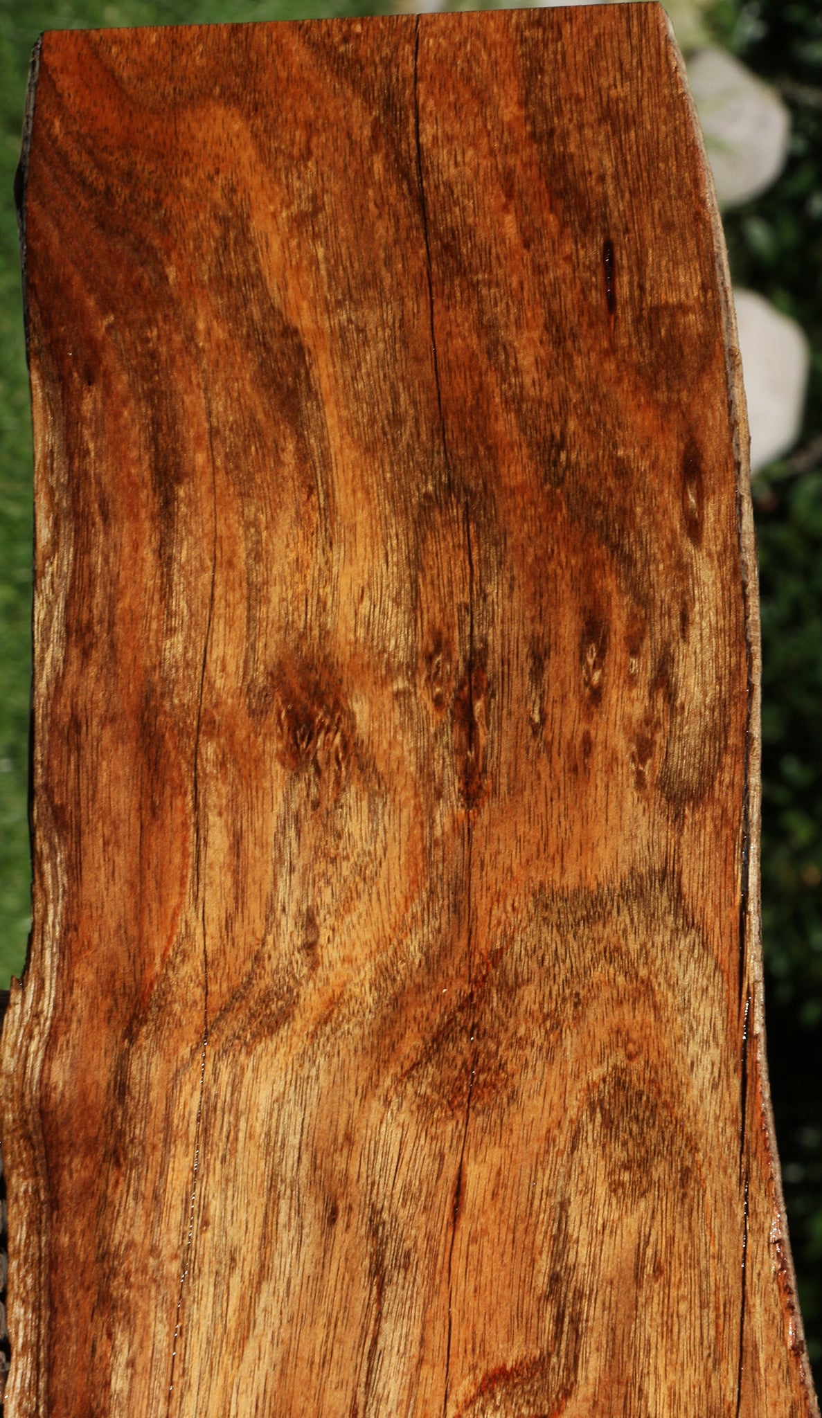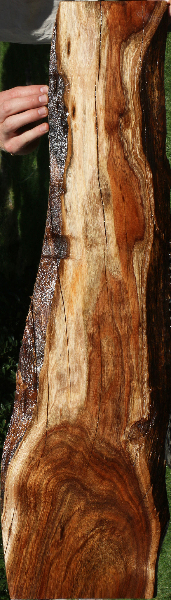 This Silver Wattle wood was cut from two very large logs that had a good amount of color and fiddleback. It is kiln dried and has been surfaced on two sides. A minor end or edge check may be present. Boards over 36" in length may have a 1/16" to 1/8" bow or twist present. Some boards have spalting which can be stable or soft in areas, but can easily be stabilized with CA glue or other stabilization methods. We have cut the majority of soft spalting off of the boards. Silver Wattle is easy to work and takes a good finish! This piece has splits and inclusions. Please see pictures for details. This piece is sold "as is" due to defects and is ineligible for a refund or return.