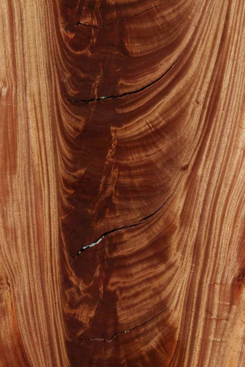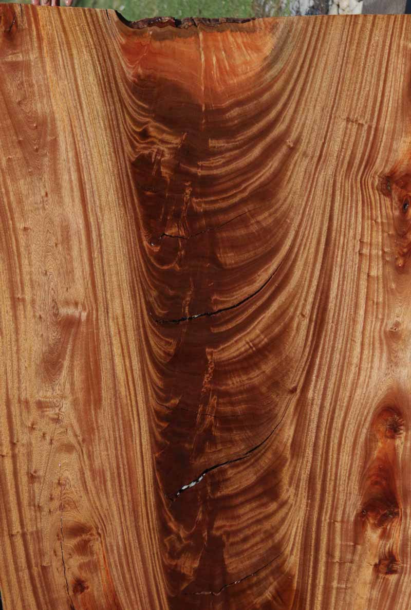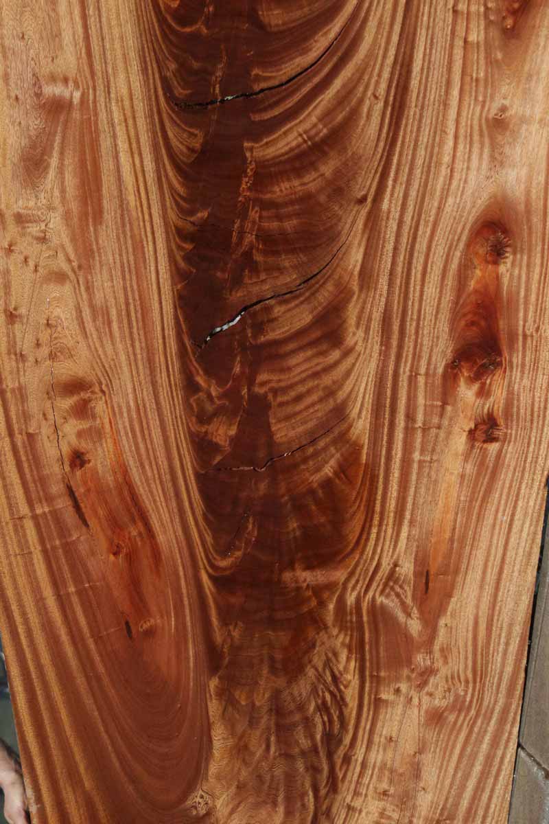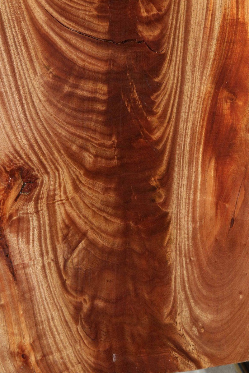 This high quality material has been kiln dried and surfaced on two sides. Pieces may have some slight planer bite in areas of high figure due to the interlocked grain. See photos for splits which can easily be filled with a clear epoxy resin. This wood glues and finishes well. This might have a cup/twist/bow up to 1/8". This slab has multiple large penetrating splits present at the center of the slab. There are numerous bark incursions present. There are some planer skips. There is a 33" long split on the right side. Must be able to work with!