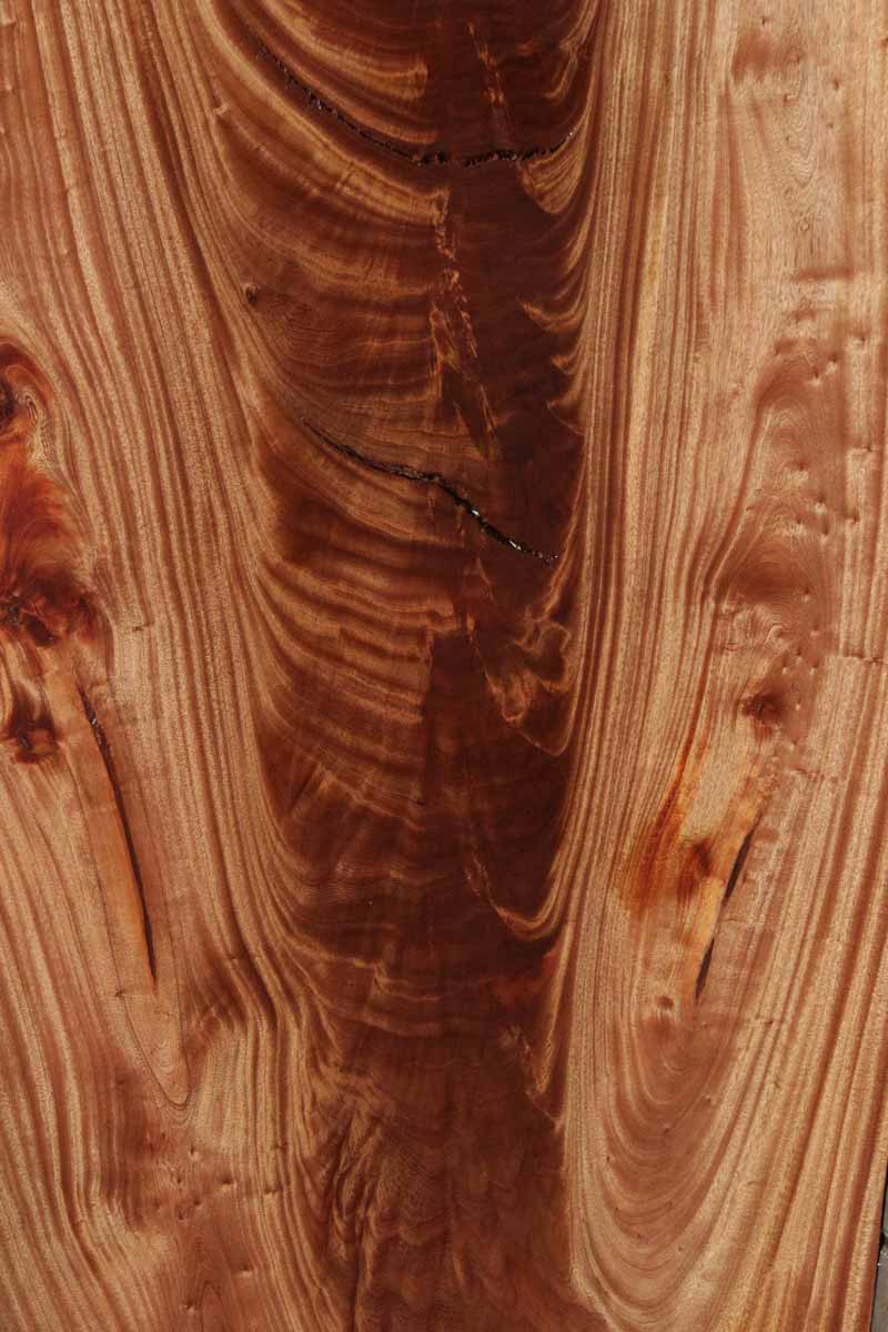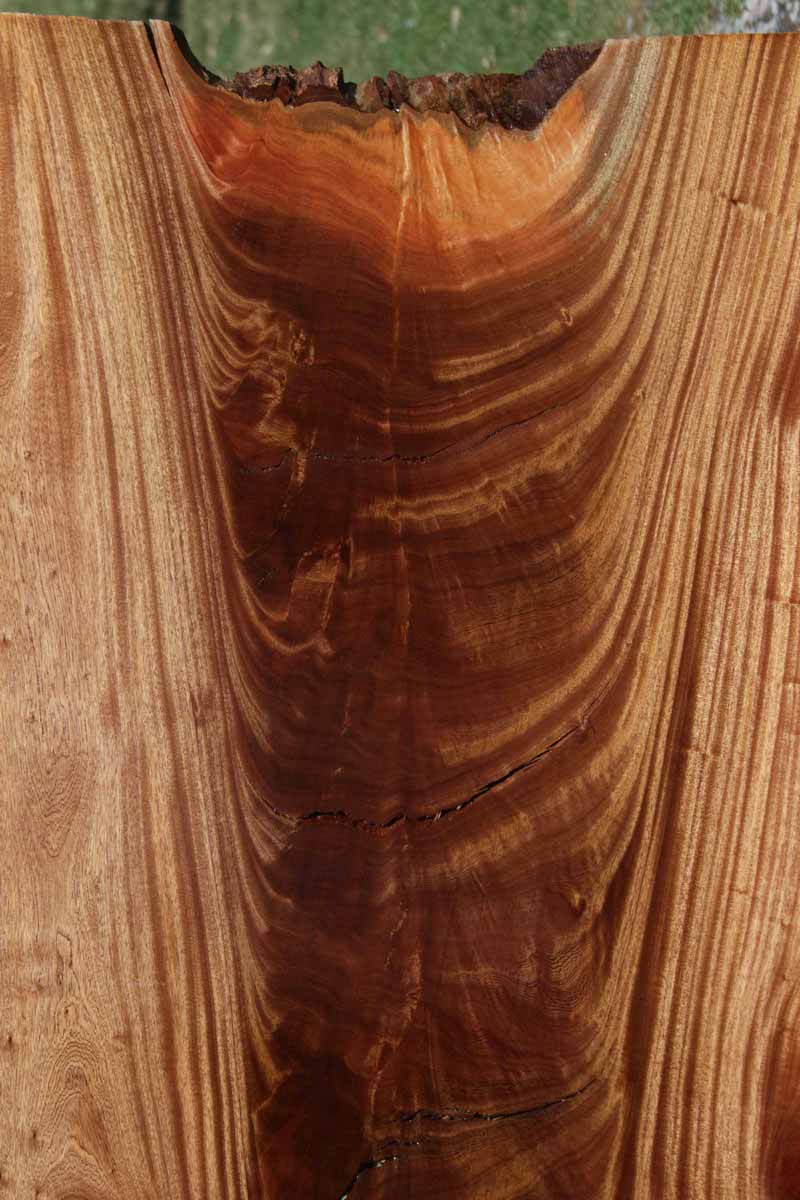 This high quality material has been kiln dried and surfaced on two sides. Pieces may have some slight planer bite in areas of high figure due to the interlocked grain. See photos for splits which can easily be filled with a clear epoxy resin. This wood glues and finishes well. This might have a cup/twist/bow up to 1/8". This slab has multiple large penetrating splits present at the center of the slab. There are numerous bark incursions present. There are some planer skips. Must be able to work with!
