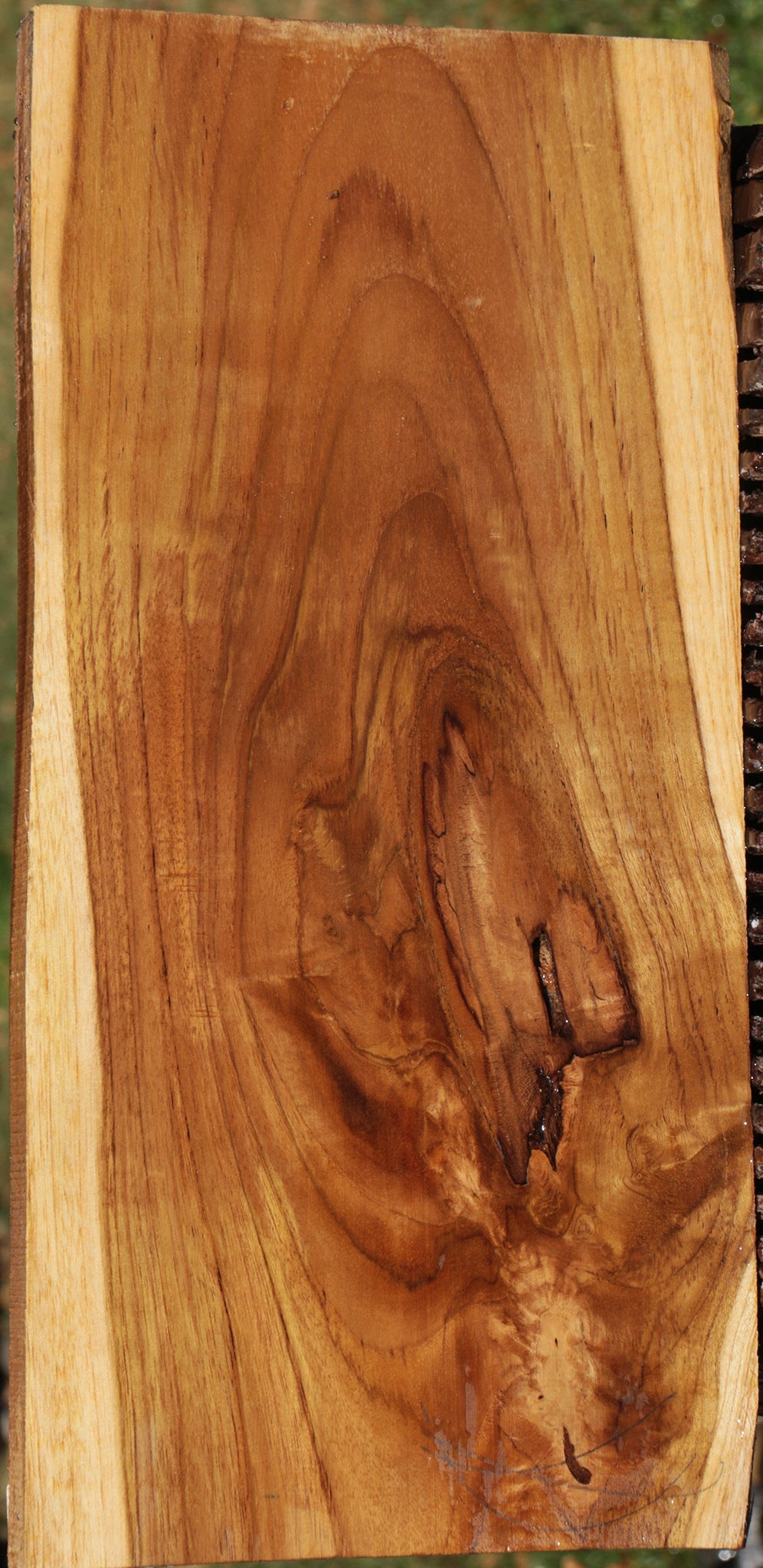 Genuine Teak is an exotic wood that is highly sought after for its water resistance, fragrant aroma, and smooth luster. A great beginner wood, this species is easy to work and very beautiful when finished. It has a moderate blunting effect on blades. This high quality lumber has been kiln dried and surfaced on two sides. An occasional partial live edge is present on some. Knots and crotchwood figured areas may contain checks or voids. A slight bow may exist in boards over 3 ft. in length. Enjoy this workable and lustrous species! This piece has checks and inclusions. Please see pictures for details.