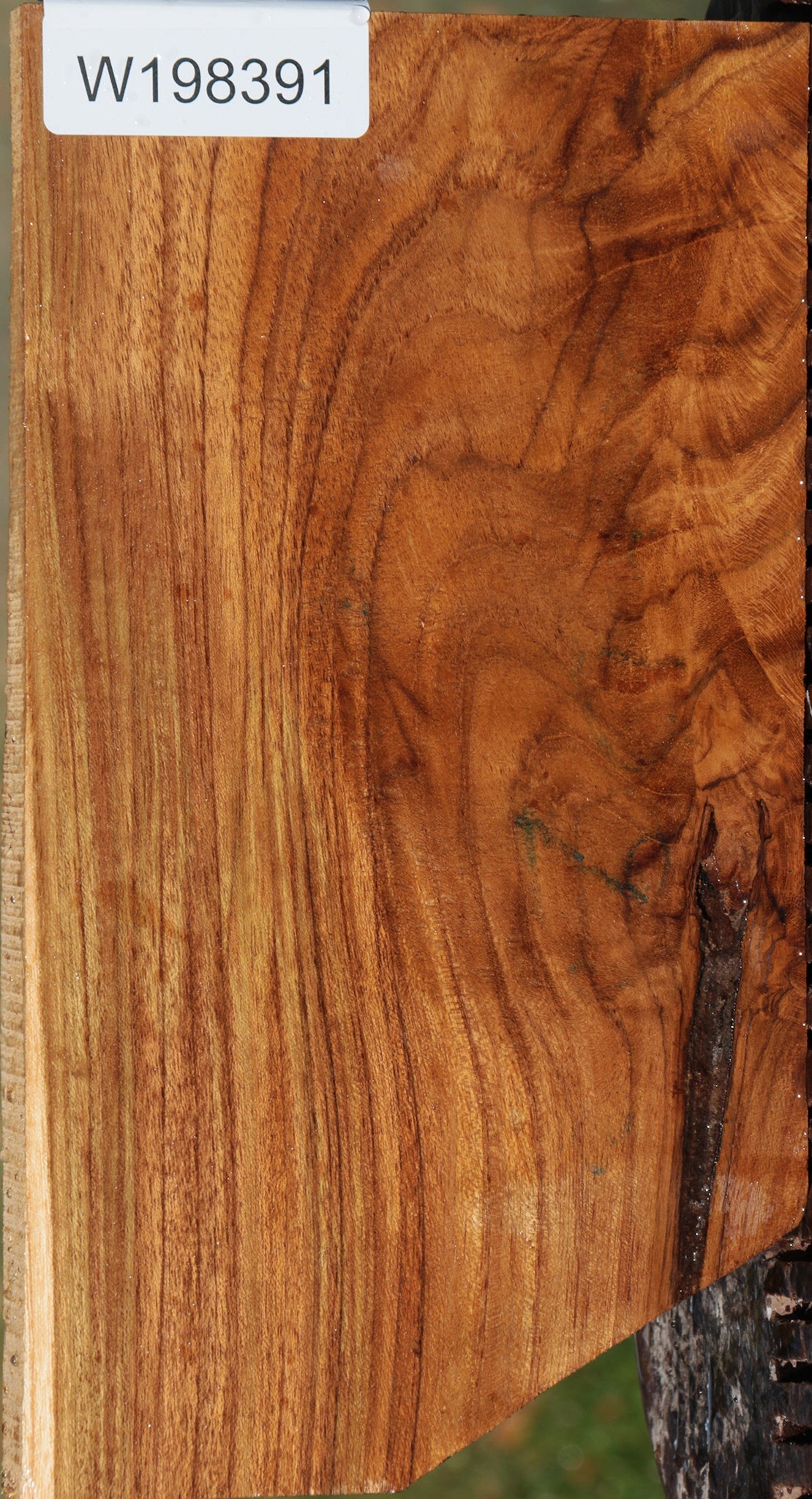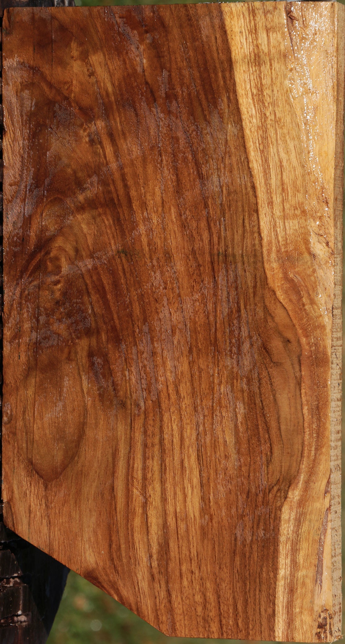 Genuine Teak is an exotic wood that is highly sought after for its water resistance, fragrant aroma, and smooth luster. A great beginner wood, this species is easy to work and very beautiful when finished. It has a moderate blunting effect on blades. This high quality lumber has been kiln dried and surfaced on two sides. An occasional partial live edge is present on some. Knots and crotchwood figured areas may contain checks or voids. A slight bow may exist in boards over 3 ft. in length. Enjoy this workable and lustrous species! This piece has a partial live edge, checks, and inclusions. Please see pictures for details.
