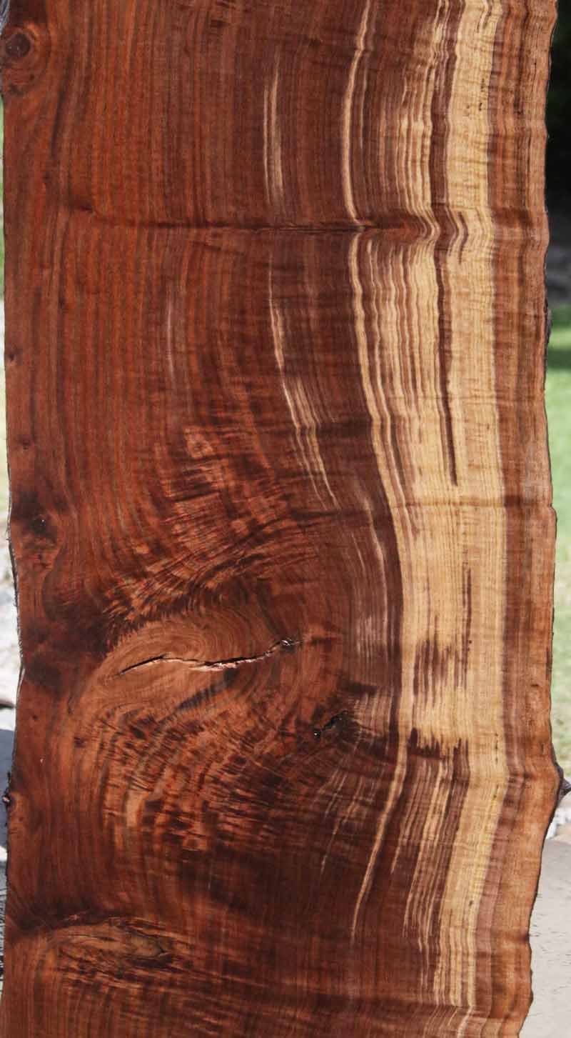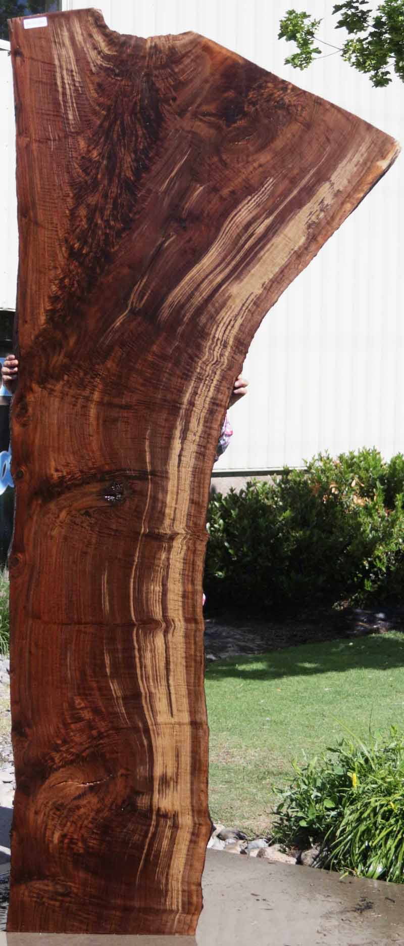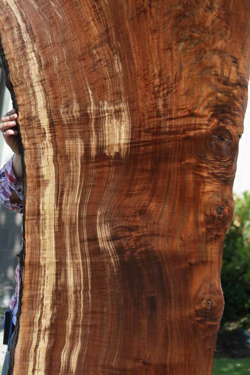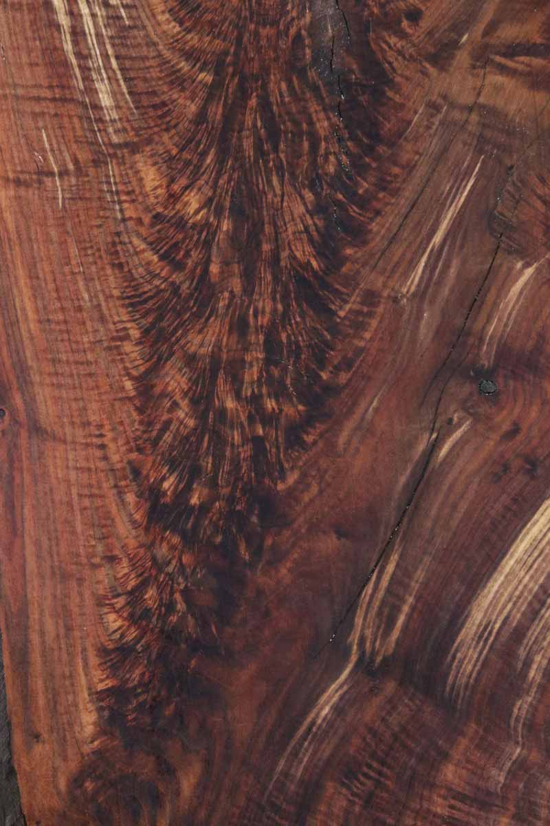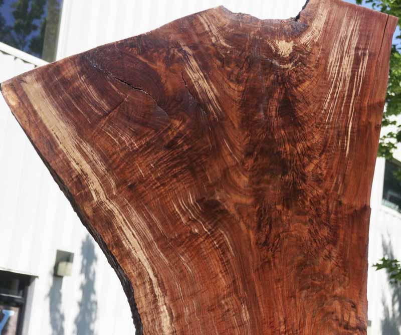 This piece has one live edge, one rustic edge, and the length was measured from the crotch. It has really nice fiddleback and crotchwood figure! It has some end splits and has a bark incursion where the knot is on the narrow section. This piece is also bookmatched with piece W142701!