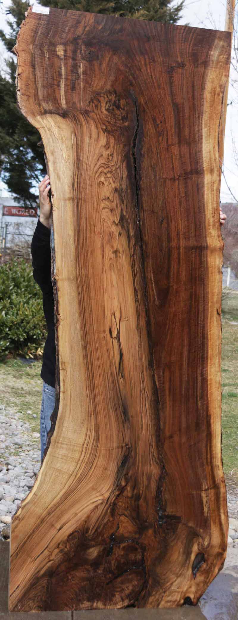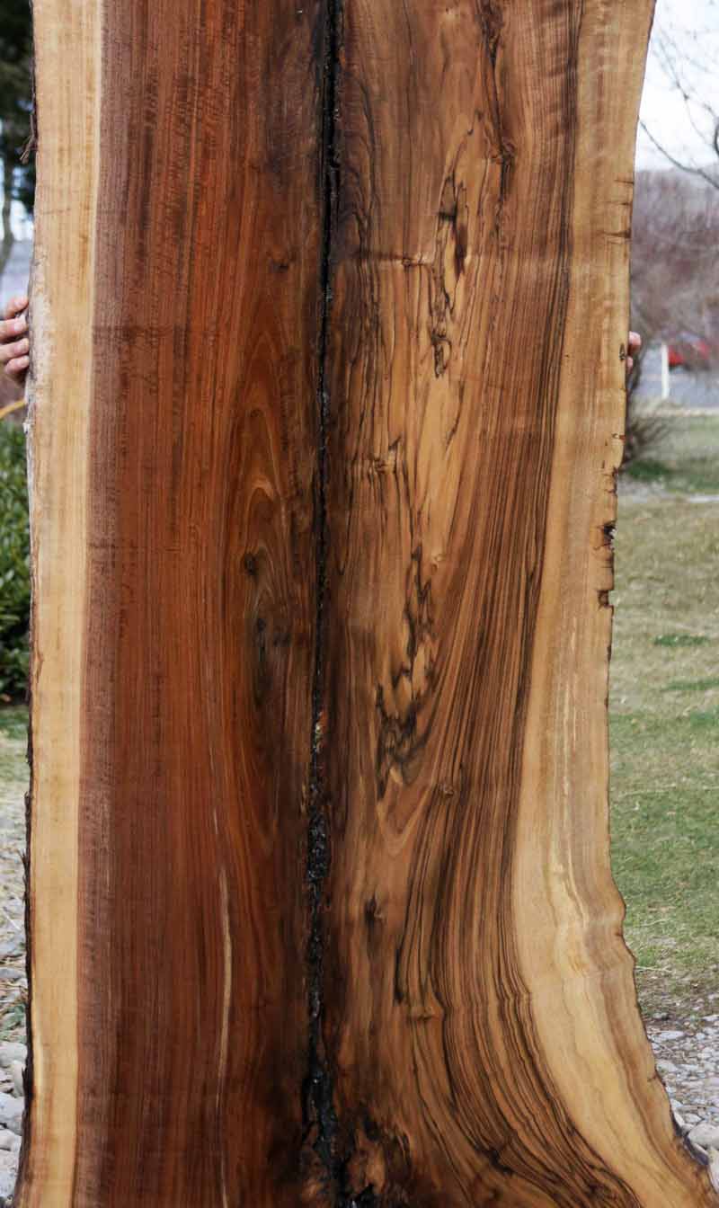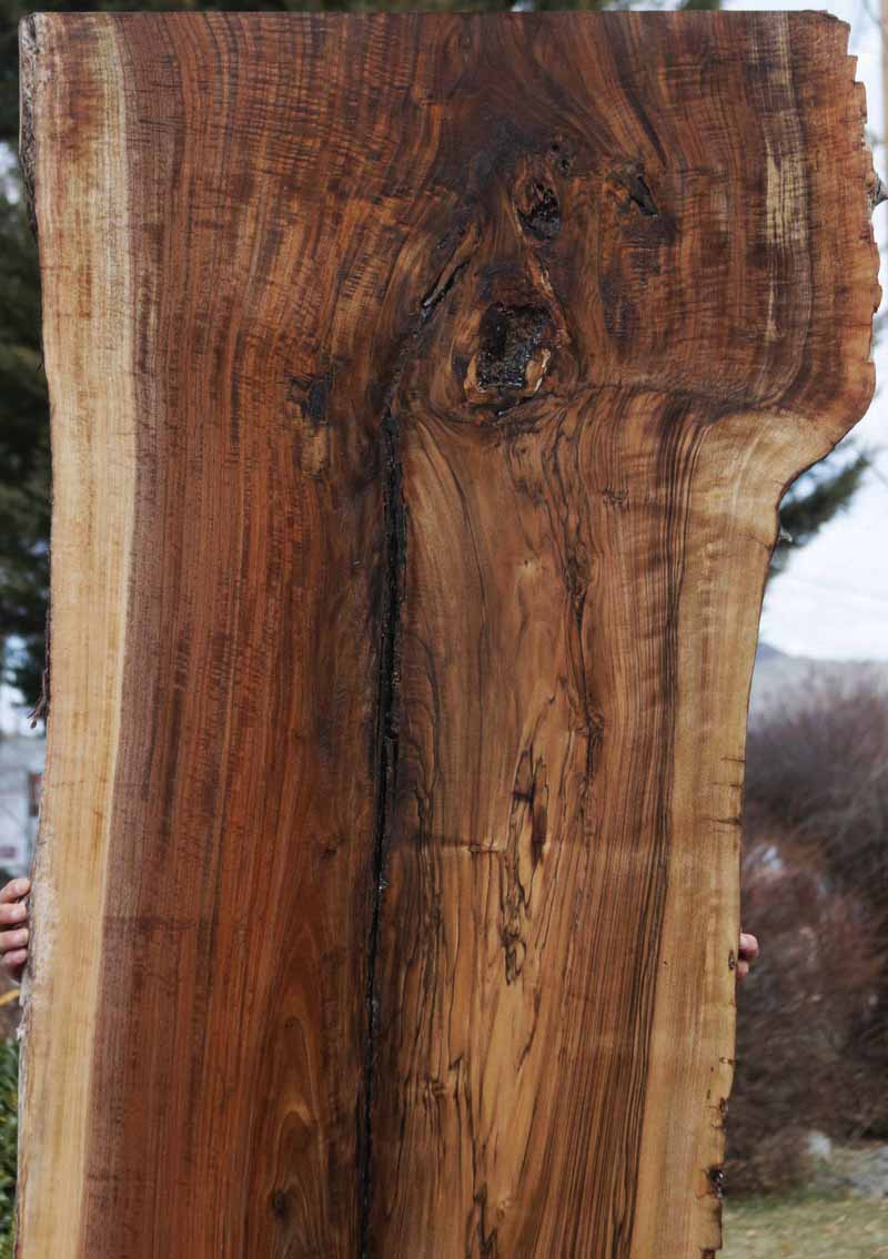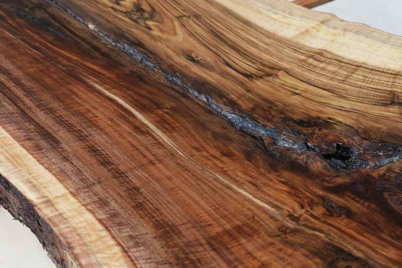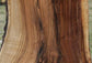 These beautiful slabs were cut from carefully hand selected Walnut logs. Kiln dried and planed on both sides, you’ll enjoy working this exquisite hardwood. Photos display an exposition of color, burl, crotchwood and figure, which varies in intensity and uniqueness from piece to piece depending on which part of the log the wood was cut from. Live edges may have areas of bark or checks. Slabs unique features may include checks, bug holes, incursions, or other natural characteristics that make wood unique! This slab has rustic incursions present. Epoxy is recommended. There are fiddleback and burl present all throughout the piece!