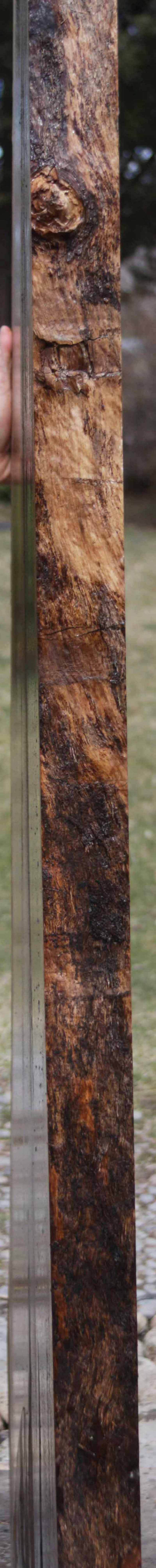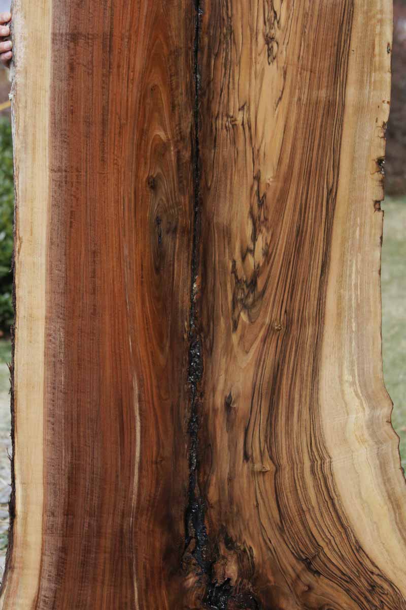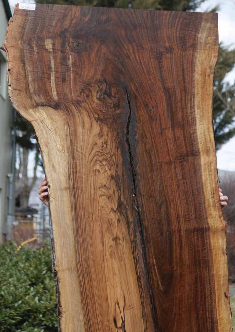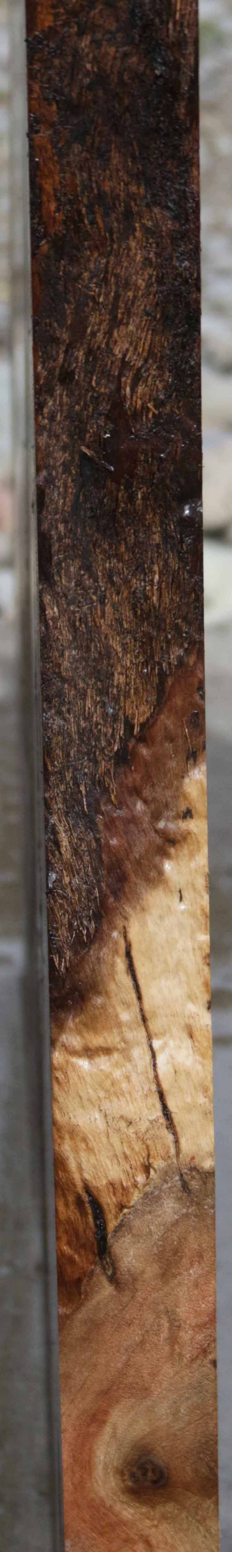These beautiful slabs were cut from carefully hand selected Walnut logs. Kiln dried and planed on both sides, you’ll enjoy working this exquisite hardwood. Photos display an exposition of color, burl, crotchwood and figure, which varies in intensity and uniqueness from piece to piece depending on which part of the log the wood was cut from. Live edges may have areas of bark or checks. Slabs unique features may include checks, bug holes, incursions, or other natural characteristics that make wood unique! This slab has rustic incursions present. Epoxy is recommended. There are fiddleback and burl present all throughout the piece!