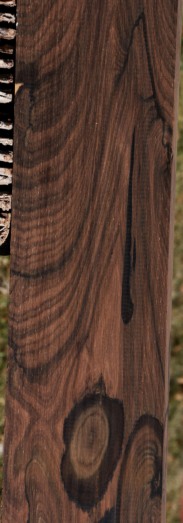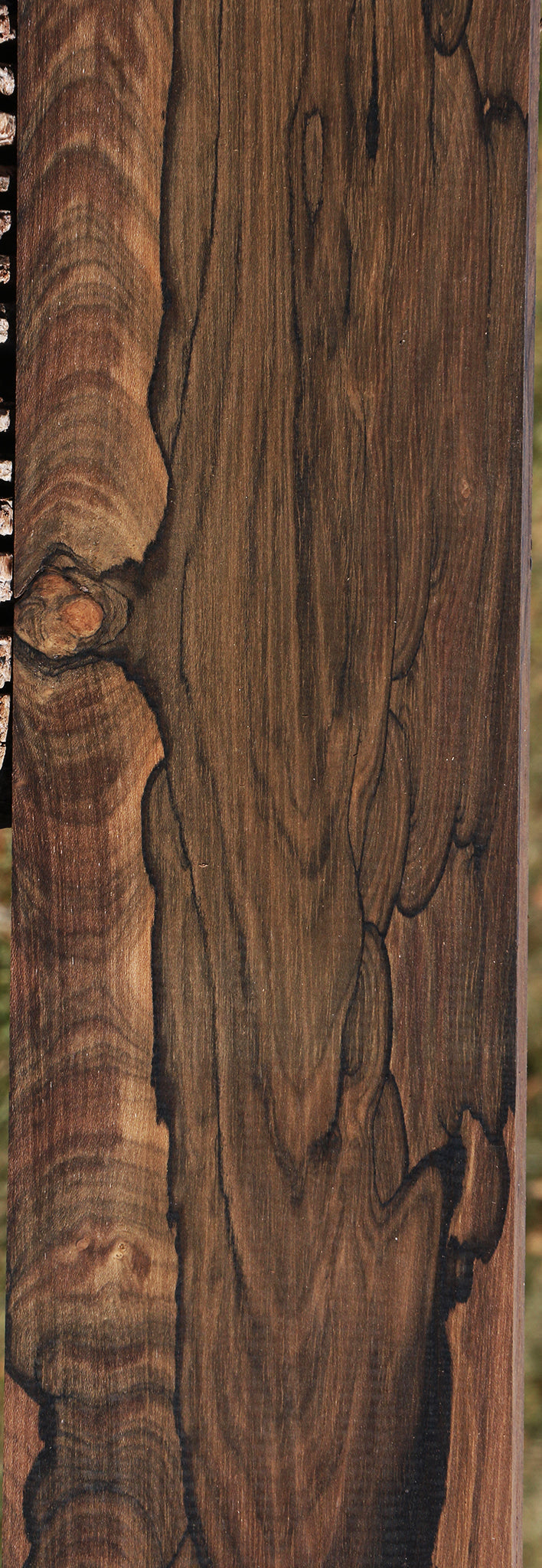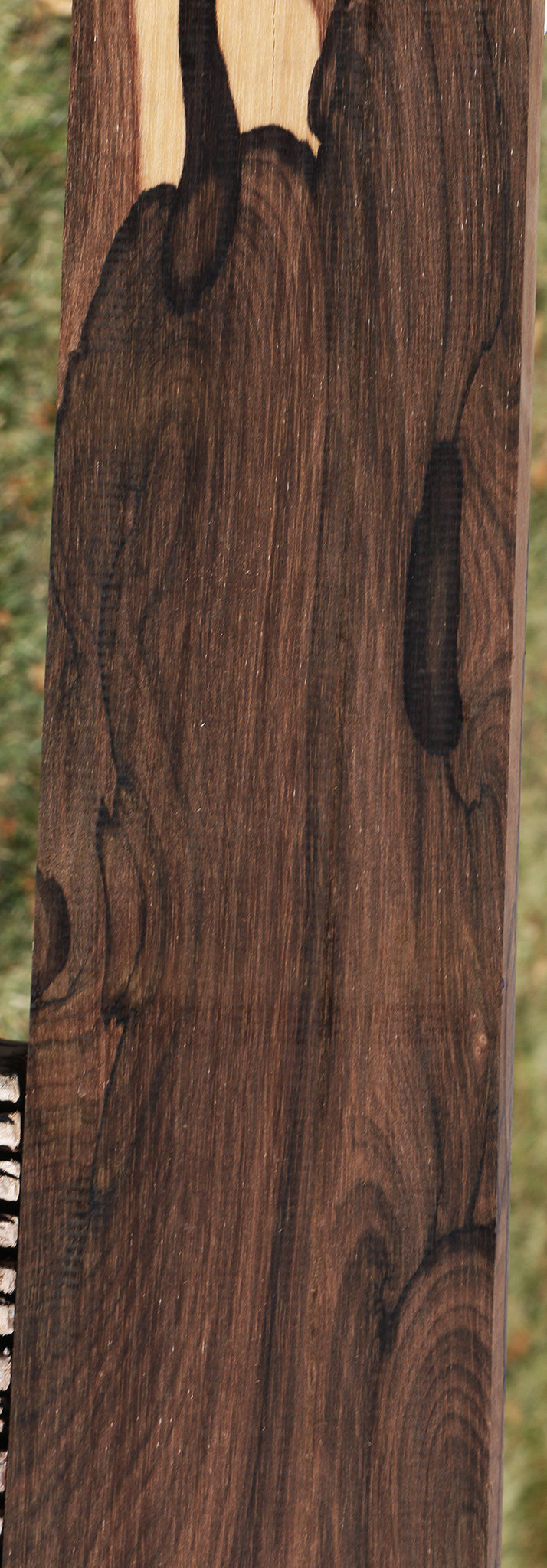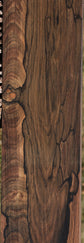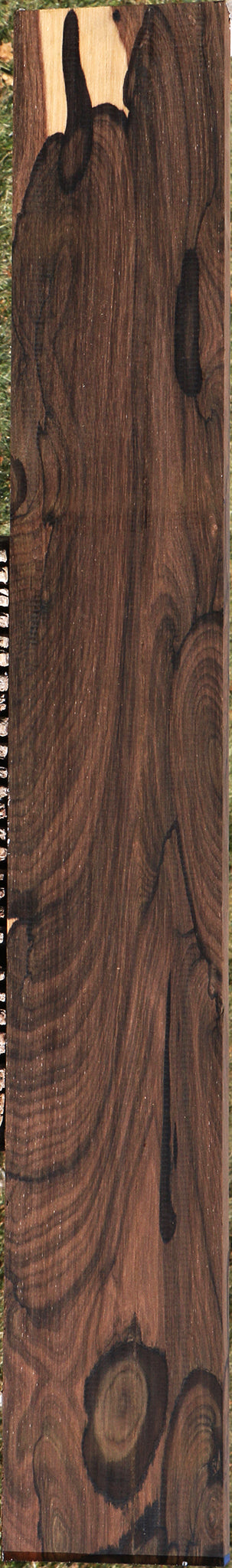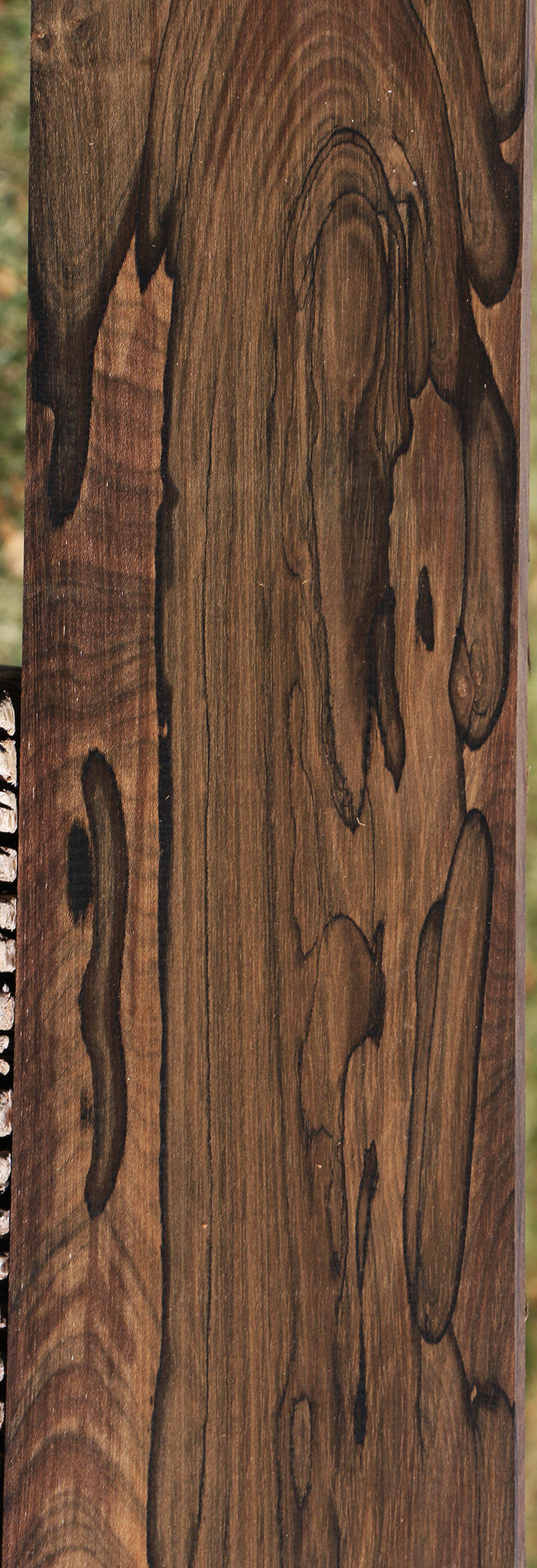 This beautiful Ziricote has been partially air dried and contains residual moisture. Lumber is surfaced on two sides and is wax sealed on the ends. Occasional faint hairline checks may be present in black streaks; these are usually on or near the sapwood. Minor end checks may be present. A 1/8" bow or twist may be present. This wood is exceptionally high quality, A grade material. It is the same material that we use to cut instrument sets that are sold to larger instrument companies. It is getting much harder to obtain, so stock up and take advantage of the wonderful pricing! This is beautiful, high quality, hard-to-find Ziricote! This piece has checks, splits, and inclusions. Please see pictures for details.