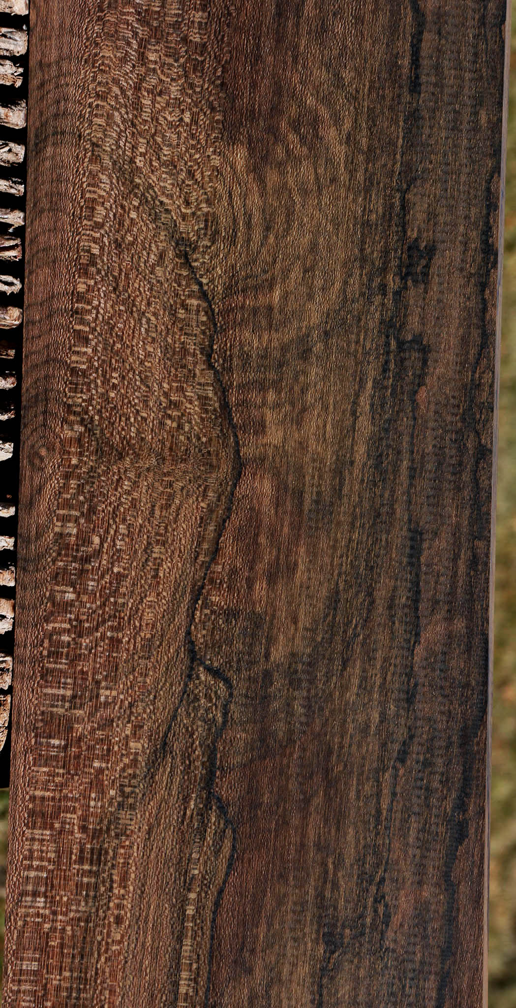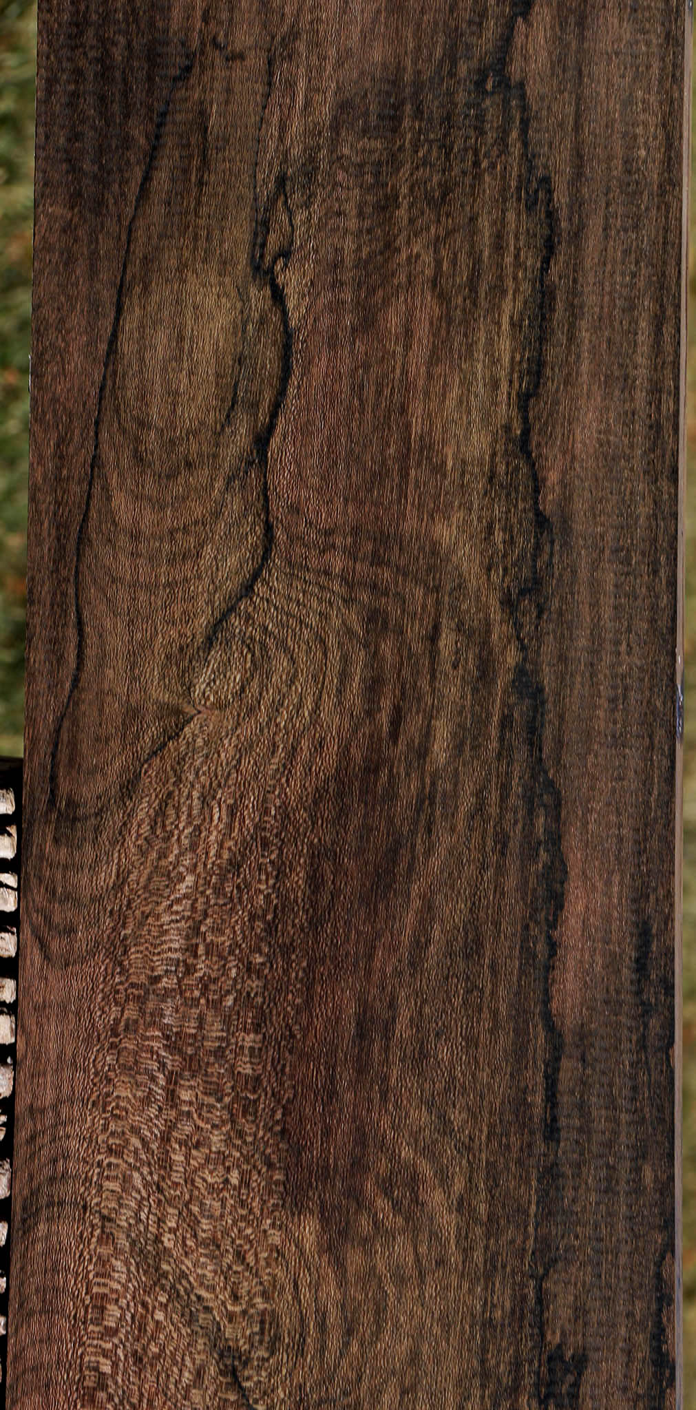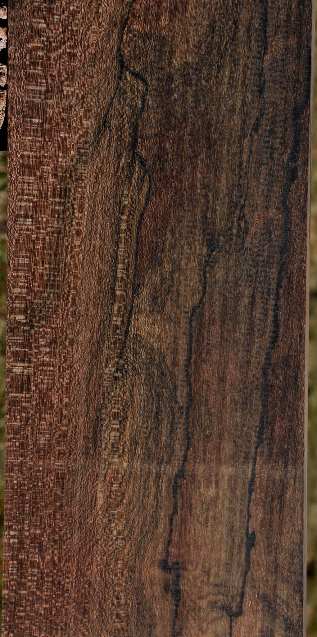 This beautiful Ziricote has been partially air dried and contains residual moisture. Lumber is surfaced on two sides and is wax sealed on the ends. Occasional faint hairline checks may be present in black streaks; these are usually on or near the sapwood. Minor end checks may be present. A 1/8" bow or twist may be present. This wood is exceptionally high quality, A grade material. It is the same material that we use to cut instrument sets that are sold to larger instrument companies. It is getting much harder to obtain, so stock up and take advantage of the wonderful pricing! This is beautiful, high quality, hard-to-find Ziricote! This piece has checks. Please see pictures for details.